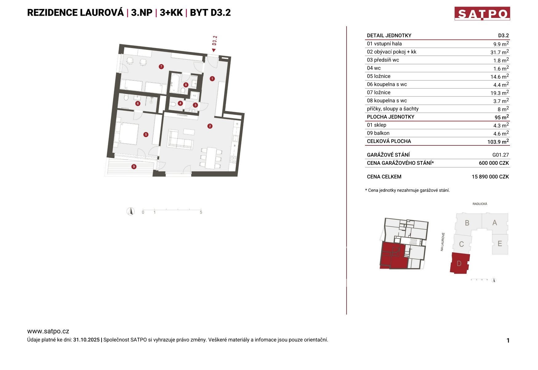 Hledáte výjimečný prostor, kde se snoubí velkoměstský styl s klidem a soukromím? Představujeme vám prostorný byt 3+kk s naprosto jedinečnou dispozicí, který nabízí dvě ložnice se samostatnými koupelnami, prostorný obývací pokoj, balkon a třetí toaletu s předsíňkou. Byt se nachází ve 3. NP novostavby Rezidence Laurová v atraktivní lokalitě Prahy 5 - Smíchov. Nabízí komfortní rodinné bydlení s výhledem do klidné ulice, vnitroblok plný zeleně a výbornou dostupnost do centra města. Dům i samotný byt je v prémiovém standardu s důrazem na moderní technologie: - podlahové vytápění - rekuperace vzduchu - videotelefon, čipový vstupní systém - dřevěné podlahy a bezfalcové dveře o výšce 2,1 m - balkony a terasy s keramickou mrazuvzdornou dlažbou. Celková užitná plocha bytu včetně balkonu a sklepa činí 103,9 m2. Ze vstupní haly je přístup do první ložnice o výměře 19,3 m2, která disponuje vlastní koupelnou s vanou a toaletou. Pokoj nabízí také dostatek prostoru pro realizaci vestavěného úložného řešení. Hala dále plynule navazuje na prostorný obývací pokoj s přípravou na kuchyňský kout o rozloze 31,7 m2, který tvoří přirozené centrum bytu. Z obývacího pokoje je vstup do 14,6 m2 velké hlavní ložnice s druhou soukromou koupelnou se sprchovým koutem a toaletou. Z obou místností je přímý vstup na jihozápadně orientovaný balkon, ideální pro posezení při západu slunce. Byt nabízí i další samostatnou toaletu s předsíňkou pro větší komfort a pohodlí. K bytu náleží garážové stání, které však není zahrnuto v ceně bytu. Rezidence Laurová je privátním prostorem, který nabízí moderní životní styl pod jednou střechou. Součástí společných prostor je reprezentativní vstupní hala s recepcí 24/7, zasedací místnost pro soukromá jednání, prostor pro kočárky, kola a koloběžky a oplocený vnitroblok s parkovou úpravou. Na střeše domu je umístěna společná pobytová střešní zahrada SKY TOP se zelení, kuchyňkou a pergolou. Architektonicky výjimečný dům s propracovanými detaily a službami na úrovni moderního městského života vznikající v lokalitě s duchem i perspektivou. Nabízí celkem 123 bytových jednotek s dispozicemi 1+kk až 5+kk a také 8 komerčních prostor. Nachází se mezi ulicemi Radlická a Na Laurové. Jedná se o jedinečnou a vyhledávanou oblast, kde se prolíná příroda, zázemí pro sport, nákupy i společenský život. Nabízí klidné prostředí pro relaxaci, přesto i vynikající dostupnost centra a dalších důležitých lokalit hlavního města. Už na jaře 2027 bude rezidence připravena poskytnout vám nadčasové bydlení ve vysokém standardu. Jste připraveni psát nový příběh na mimořádném místě? Napište nám. Rádi vás vaším novým domovem provedeme prostřednictvím virtuální reality.