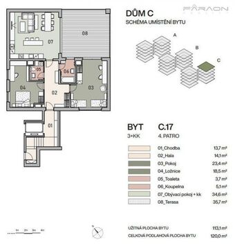 Nabízíme Vám nadstandardně prostorný, dokončený byt 3+KK o ploše 119,2 m2 s terasou 37,4 m2 v komorním projektu tří bytových domů v Rezidenci Klíčov, v srdci Vysočan, v klidu a zeleni, nedaleko metra Vysočanská. Byt se nachází v 5. nadzemním podlaží a je orientován na všechny světové strany, na patře je to samostatný byt, který nemá sousedy. Byt nabízí velkou míru soukromí včetně posezení na velké vlastní terase s krásným výhledem. V blízkosti se nachází nákupní centrum Fénix a Galerie Harfa, škola, školka, pošta, poliklinika, O2 Arena a všechny potřebné služby, ale i množství zeleně, Sady na Klíčově, Klíčovský háj nebo park Podviní. V docházkové vzdálenosti je stanice metra B Vysočanská, autobusová zastávka se spojením do Kobylis, na Českomoravskou, Prosek, Střížkov, Skalku, Opatov, Chodov a do dalších lokalit a vlaková stanice Praha-Vysočany. Skvělé spojení i na dálnice D8 a D10. K bytu je třeba dokoupit sklep (cena 67 200 Kč/m2). Parkovací místo lze k bytu přikoupit (uzavřená dvojgaráž nebo venkovní parkovací stání). Koupě přímo od developera, neplatíte provizi. Stavba je dokončena, nastěhování bude možné cca koncem února. Prohlídky po předchozí dohodě jsou možné. ID nemovitosti SSA1407-0001. <a href="https://www.eurobydleni.cz/byty/3_kk/praha-9/obec-vysocany/prodej/"><strong>Prodej bytu 3+kk Praha 9, Vysočany</strong></a>