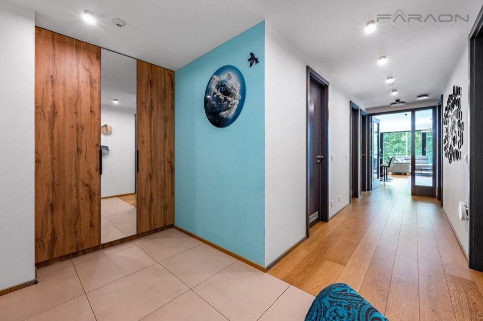 Moderní prémiový byt 3+kk na prodej o celkové ploše 137,9 m2, s prostornou jihozápadní terasou. V ceně je zahrnut sklep, dvě extra velká podzemní garážová stání i celé nadstandardní vybavení na míru, v hodnotě 3 mil Kč. Příjemně světlý byt se nachází ve 2. podlaží prestižní "Top' Rezidence Pomezí" v lokalitě Praha 5 - Košíře, zkolaudované v 6/2021, přímo u lesoparku Cibulka a Vidoule, s vynikající dostupností do centra města. Orientace nemovitosti do zeleně zaručuje maximální soukromí a velmi příjemnou zenovou atmosféru s úžasným pocitem klidu a harmonie. Moderní technologie, elegantní design a vysoké standardy bytu podtrhují jeho špičkovou kvalitu: - decentralizovaný systém větrání s rekuperací tepla a vlhkosti, s možností přichlazování - inteligentní řízení domácnosti - dřevěné podlahy s integrovaným fan-coilovým vytápěním - velkoformátová dřevěná okna s trojsklem, venkovní elektrické hliníkové žaluzie - podlahové vytápění v koupelnách - detektory požáru a zaplavení, osvětlení s pohybovými senzory - optický internet s datovými rozvody ve všech pokojích - prémiové zařizovací předměty a materiály v celém bytě - designové koupelny, kuchyň a ložnice na míru, značky Poggenpohl Vnitřní obytný prostor o rozloze 119,9 m2 zahrnuje vstupní chodbu, ložnici s en-suit koupelnou (sprchový kout + toaleta), druhou ložnici / pracovnu, otevřený koncept obývacího pokoje s jídelním místem a kuchyní, hlavní koupelnu (vana + sprchový kout), samostatnou toaletu a technickou místnost / komoru. K bytu náleží velká terasa (18 m2) s výsuvnou markýzou, přístupná z obývacího pokoje, ideální pro venkovní posezení a relaxaci. Velmi žádaná lokalita. Klidná, rodinná prémiová čtvrť s kompletní občanskou vybaveností: škola, školka, potraviny, restaurace, pošta, sportovní vyžití, rychlá dostupnost do nákupních center Nový Smíchov a Galerie Butovice. Těsná blízkost lesoparků a turistických stezek, včetně rozhledny Cibulka. Vynikající MHD spojení. Autobusová zastávka je hned za rohem. Nejbližší stanice metra Jinonice 15 minut chůze. 800 metrů od domu se nachází vlaková stanice s přímým spojením na Zličín nebo Smíchov. Autem se na Anděl dostanete za 10 minut. Shrnutí: podlahová plocha bytu 119,9 m2, terasa 18 m2, sklep 11 m2, dvě extra velká garážová stání. PENB-B ID nemovitosti MDO0620-0001.