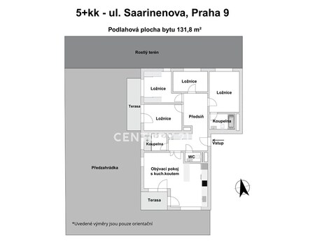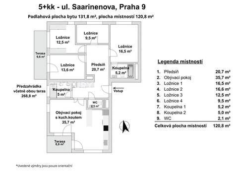 PRODÁNO Představte si prostor, pohodlí a soukromí velkého rodinného domu za Prahou, ale bez únavného dojíždění, nikdy nekončící údržby a slabé občanské vybavenosti. Takový je tento moderní byt 5+kk prémiové kvality v novostavbě z roku 2019, s velkou předzahrádkou, se dvěma terasami, dvěma garážovými stáními vedle sebe a sklepní kójí. Nachází se v atraktivním developerském projektu YIT Suomi Hloubětín na Praze 9 uprostřed zeleně, a přitom s rychlou a pohodlnou dostupností různých částí Prahy autem, metrem nebo tramvají. Jedno s druhým dělá z tohoto 5+kk opravdu kvalitní bydlení pro velkou a náročnou rodinu. Takové nemovitosti se objevují na trhu jen výjimečně. Nenechte si ujít tuto mimořádnou příležitost. --------- DOSTATEK PROSTORU UVNITŘ I VENKU NA SOUKROMÉ ZAHRADĚ Moderní byt umístěný v 1. nadzemním podlaží zaujme svou prostorností, světlostí a promyšleným dispozičním řešením na celkové podlahové ploše 131,8 m2: - velkorysý obývací pokoj s kuchyňským koutem (35,7 m2) pro rodinnou zábavu, vaření i stolování, s přímým vstupem na terasu a vlastní zahradu - čtyři samostatné neprůchozí pokoje (16,5 m2, 13,6 m2, 12,5 m2, 9,5 m2) poskytují využití jako ložnice, dětský pokoj, pracovna, šatna, pokoj pro hosty apod. - dvě koupelny (jedna s vanou, druhá se sprchou typu walk-in) - dvě WC (jedno samostatné, druhé v koupelně s vanou) - dvě terasy (9,6 m2, resp. 6,6 m2, celkem 16,2 m2) - výstup francouzskými okny ven z vícero místností. /Pozn. Plocha místností činí 120,8 m2./ --------- K bytu náleží a již je zahrnuto v ceně: - vlastní předzahrádka se dvěma terasami, herními prvky a zahradním domkem (268,8 m2), která od rána do večera vybízí k odpočinku, grilování, dětským hrám nebo pobíhání vašich čtyřnohých mazlíčků - dvě garážová stání v podzemní garáži umístěná vedle sebe - sklepní kóje. --------- NADSTANDARDNÍ PROVEDENÍ PRO NÁROČNÉ - nejvyšší dostupný standard od developera YIT: lepší protihluková izolace, vyšší interiérové dveře (210 cm) nebo bezpečnostní fólie na oknech - kuchyně Hanák s vestavěnými spotřebiči AEG - podlahové vytápění v koupelně - bezpečnostní vstupní dveře Next a kamerový systém - příprava pro instalaci klimatizace nebo elektricky ovládaných předokenních žaluzií. --------- PRÉMIOVÁ LOKALITA PRO RODINNÉ BYDLENÍ Bezprostřední blízkost říčky Rokytka a její udržované okolí vybízí k procházkám, vyjížďkám na kole nebo inline bruslích a dalším volnočasovým aktivitám v přírodě. Součástí vnitrobloku pro rezidenty je velký park s dětským hřištěm. Rodiče ocení také soukromou školku hned ve vedlejší ulici a pestrý výběr dalších škol různého typu v okolí. --------- OSTATNÍ INFORMACE Byt se prodává nezařízený, zůstává pouze kuchyňská linka Hanák s vestavěnými spotřebiči AEG. Nastěhování nových majitelů možné ještě letos. Rádi pomůžeme s vyřízením hypotéky s nízkými splátkami nebo prodejem Vaší nemovitosti. Pro více informací nás neváhejte kdykoliv kontaktovat. Mluvíme česky i anglicky. Těšíme se na Vás.