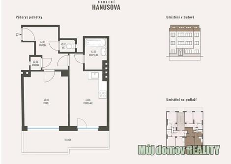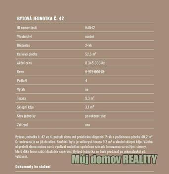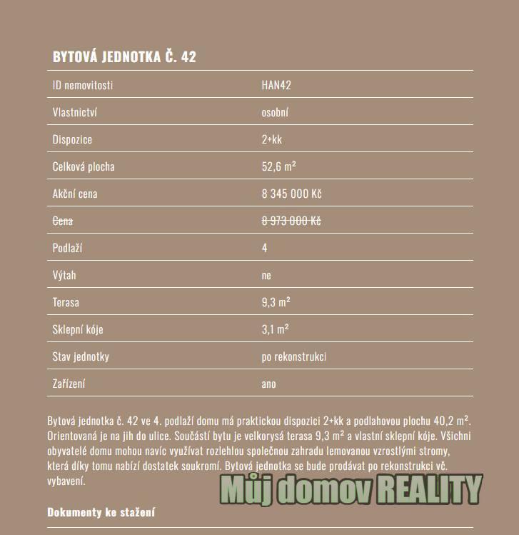 # **Prodej bytu 2+kk s terasou Hanusova, Praha 4 Michle** Nabízíme k prodeji bytovou jednotku **2+kk o ploše 52,6 m** s vlastní **terasou 9,3 m** a **sklepní kójí 3,1 m**, nacházející se ve 4. nadzemním podlaží rezidenčního projektu **Bydlení Hanusova**. Byt je po kompletní rekonstrukci vč. vybavení, takže je **ihned připraven k nastěhování**. Díky praktické dispozici a orientaci na jih do klidné ulice nabízí komfortní bydlení v atraktivní lokalitě s rychlým spojením do centra Prahy. ## **Parametry bytu** * **Dispozice:** 2+kk * **Celková plocha:** 52,6 m * **Podlahová plocha:** 40,2 m * **Terasa:** 9,3 m * **Sklepní kóje:** 3,1 m * **Podlaží:** 4. NP * **Výtah:** ne * **Stav jednotky:** po rekonstrukci * **Zařízení:** ano * **ID nemovitosti:** HAN42 **Akční cena: 8 345 000 Kč** (původní cena: 8 973 000 Kč) ## **Lokalita Praha 4, Michle** Projekt **Bydlení Hanusova** se nachází v dynamicky se rozvíjející části Prahy 4, která nabízí ideální kombinaci **městského komfortu a zeleně**. ### Dopravní dostupnost * metro **Budějovická** a **Pankrác** 10 minut chůze * autobusové a tramvajové linky v blízkosti domu * výborné napojení na Pražský okruh a dálnici D1 ### Občanská vybavenost * obchodní centrum **Arkády Pankrác** a **DBK Budějovická** v pěší vzdálenosti * školy, školky, gymnázia a dětská hřiště v okolí * poliklinika Budějovická, lékárny a veškeré zdravotní služby ### Volný čas a příroda * **společná zahrada** v rámci projektu s posezením a grilem * parky a sportoviště v docházkové vzdálenosti * oblíbený **Park Jezerka** a **Nuselský park** v blízkém okolí ## **Výhody projektu Bydlení Hanusova** * byty po rekonstrukci připravené k nastěhování * praktické dispozice s balkony, terasami nebo předzahrádkami * možnost využívat společnou zahradu ve vnitrobloku * skvělá dostupnost do centra i na hlavní dopravní tepny * atraktivní volba jak pro **vlastní bydlení, tak investici** **Kontakt na prodejce** **Můj domov REALITY s.r.o.** Makléřka: **Lidiya Savynets** +420 775 604 602 [muj.domov.reality@seznam.cz] WhatsApp / Viber / Telegram: **@LidiyaSyvynets** <a href="https://www.eurobydleni.cz/domy/vicegeneracni-domy/liberec/obec-liberec/prodej/"><strong>Prodej vícegeneračního domu Liberec</strong></a>