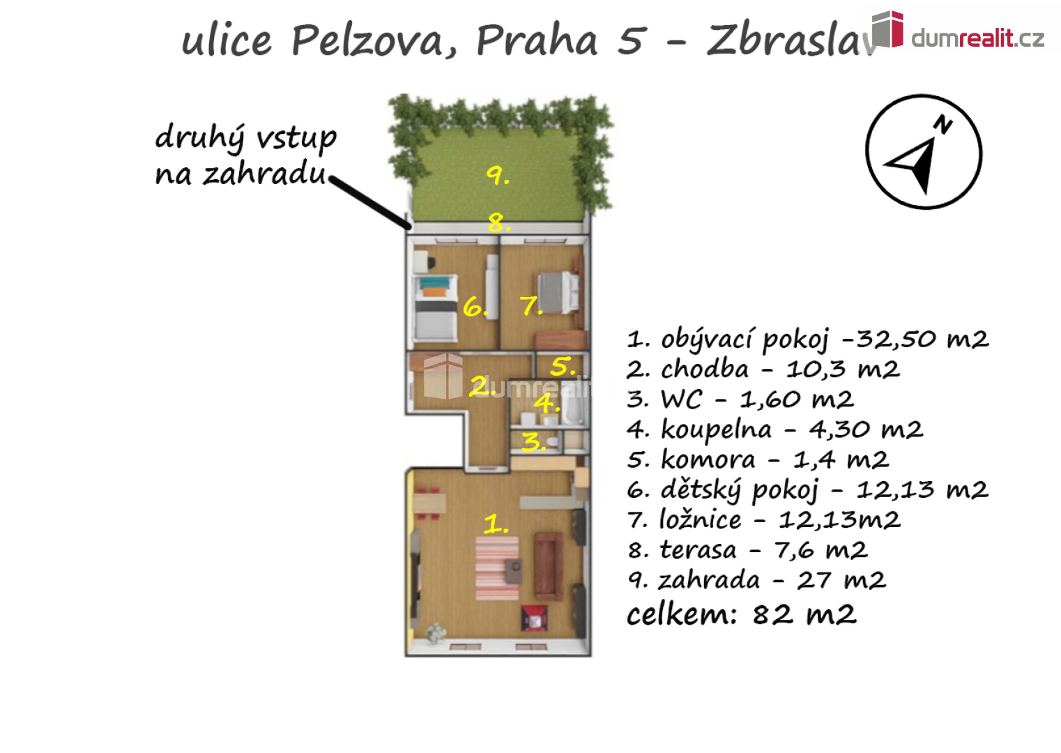 Dumrealit.cz Vám zprostředkuje exkluzivně koupi velmi pěkného bytu 3+kk (74,4 m2) s terasou (7,6 m2) a zahradou (27 m2) v atraktivní lokalitě Prahy 5 - Zbraslav, ulice Pelzlova. Byt se nachází ve zvýšeném přízemí novostavby z roku 2000 a je bezbariérový. Dispozici bytu tvoří: prostorný obývací pokoj s kuchyňským koutem (32,50 m2), ložnice (12,13 m2) a dětský pokoj (12,13 m2) se vstupem na terasu (7,6 m2) a zahradu (27 m2). Dále tvoří dispozici prostorná chodba s vestavěnou skříní a úložnými prostory (10,3 m2), komora (1,40 m2), samostatné WC (1,60 m2) a koupelna s vanou, umyvadlem a prostorem na pračku (4,30 m). Zahrada u bytu je zcela uzavřena, jsou zde vzrostlé túje a také další extra vstup z centrální zahrady domu, kde je pouze pro majitelé bytů menší park s dětským hřištěm. Menší park ve vnitrobloku tvoří pohodovou rodinou atmosféru. V domě je také kočárkárna, přímo na patře bytu. V ceně nemovitosti jsou vestavěné skříně a kuchyně + spotřebiče, ostatní dle dohody. Byt je v osobním vlastnictví, není zatížen hypotečním úvěrem. SVJ nemá úvěr, FO je 20 Kč / m2, SVJ opravovalo nyní střechu, další investice se aktuálně neplánují, vše funguje jak má. Náklady na byt, resp. na 5 osob jsou cca 6 k + elektrika. Na podlaze v bytě jsou plovoucí podlahy a dlažba, okna jsou plastová, v bytě je alarm. Přímo v ulici Pelzova je lékárna, za rohem je Albert, park Sluneční Náměstí, kavárny, dětské hřiště Jaromíra Vejvody, restaurace, květinářství, školy, školky, lékaři a poliklinika, v blázkosti zastávka MHD U Včely s návazností na metro B - Smíchovské nádraží. V docházkové vzdálenosti je vše, co ke klidnému bydlení potřebujete. Velmi doporučuji všem, kteří hledají klidné bydlení v bezbariérovém bytě s maximální možnou občanskou výbaveností. Komplentí prezentace bytu je na našich webových stránkách. Ev. číslo: 652161. Energetický štítek: C (102 kWh/m2/rok).