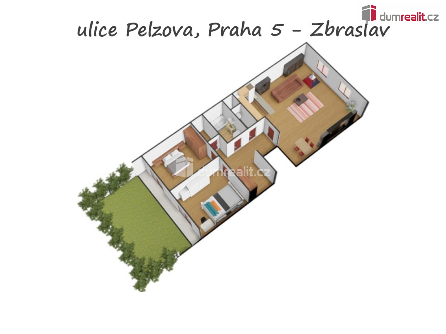 Dumrealit.cz Vám zprostředkuje exkluzivně koupi velmi pěkného bytu 3+kk (74,4 m2) s terasou (7,6 m2) a zahradou (27 m2) v atraktivní lokalitě Prahy 5 - Zbraslav, ulice Pelzlova. Byt se nachází ve zvýšeném přízemí novostavby z roku 2000 a je bezbariérový. Dispozici bytu tvoří: prostorný obývací pokoj s kuchyňským koutem (32,50 m2), ložnice (12,13 m2) a dětský pokoj (12,13 m2) se vstupem na terasu (7,6 m2) a zahradu (27 m2). Dále tvoří dispozici prostorná chodba s vestavěnou skříní a úložnými prostory (10,3 m2), komora (1,40 m2), samostatné WC (1,60 m2) a koupelna s vanou, umyvadlem a prostorem na pračku (4,30 m). Zahrada u bytu je zcela uzavřena, jsou zde vzrostlé túje a také další extra vstup z centrální zahrady domu, kde je pouze pro majitelé bytů menší park s dětským hřištěm. Menší park ve vnitrobloku tvoří pohodovou rodinou atmosféru. V domě je také kočárkárna, přímo na patře bytu. V ceně nemovitosti jsou vestavěné skříně a kuchyně + spotřebiče, ostatní dle dohody. Byt je v osobním vlastnictví, není zatížen hypotečním úvěrem. SVJ nemá úvěr, FO je 20 Kč / m2, SVJ opravovalo nyní střechu, další investice se aktuálně neplánují, vše funguje jak má. Náklady na byt, resp. na 5 osob jsou cca 6 k + elektrika. Na podlaze v bytě jsou plovoucí podlahy a dlažba, okna jsou plastová, v bytě je alarm. Přímo v ulici Pelzova je lékárna, za rohem je Albert, park Sluneční Náměstí, kavárny, dětské hřiště Jaromíra Vejvody, restaurace, květinářství, školy, školky, lékaři a poliklinika, v blázkosti zastávka MHD U Včely s návazností na metro B - Smíchovské nádraží. V docházkové vzdálenosti je vše, co ke klidnému bydlení potřebujete. Velmi doporučuji všem, kteří hledají klidné bydlení v bezbariérovém bytě s maximální možnou občanskou výbaveností. Komplentí prezentace bytu je na našich webových stránkách. Ev. číslo: 652161. Energetický štítek: C (102 kWh/m2/rok).