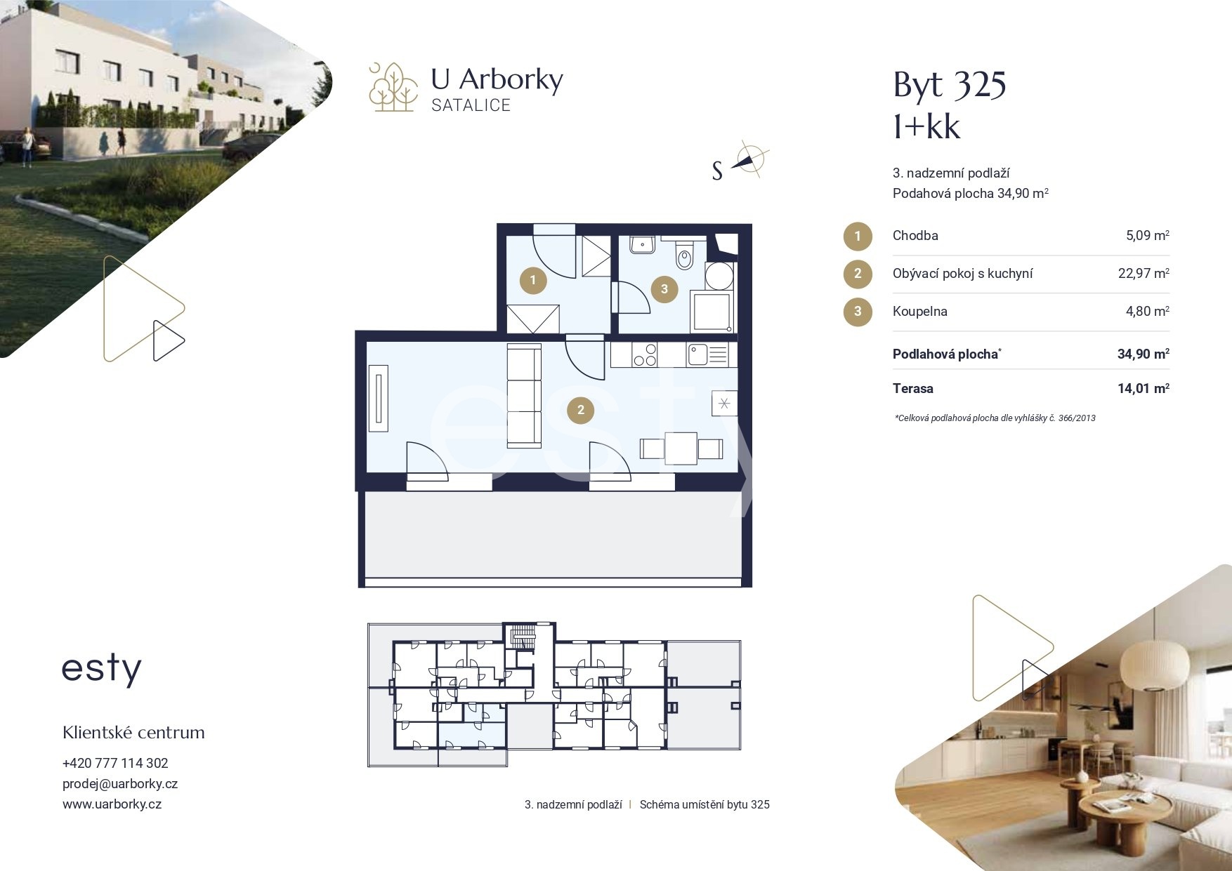 Nové moderní bydlení na pomezí města a přírody Objevte svůj nový domov v Satalicích, kde se pohodlí městského života snoubí s klidnou atmosférou přírody. Projekt U Arborky přináší moderní bydlení v harmonickém prostředí s výbornou dostupností a širokou nabídkou služeb. O projektu V rámci projektu vzniká 35 bytových jednotek o dispozicích od 1+kk po prostorné 3+kk, které splní požadavky jednotlivců i rodin. K dispozici je 58 parkovacích míst, takže parkování nebude problém. Termín dokončení Plánované dokončení projektu a možnost nastěhování: 3. kvartál 2026. Nabízený byt Tento byt se nachází ve 3. nadzemním podlaží a nabízí dispozici 1+kk s celkovou plochou 34,9 m2: • Obývací pokoj s kuchyňským koutem - 22,97 m2 • Koupelna - 4,8 m2 • Chodba - 5,09 m2 K bytu náleží také terasa o velikosti 14,01 m2. K bytu je možné dokoupit: garážové parkovací stání - 495 000 Kč venkovní parkovací stání - 300 000 Kč sklepní kóji - 80 000 Kč Moderní standardy a technologie Byt je vybaven vinylovými podlahami s dekorem dřeva a plastovými okny s trojsklem s přípravou na předokenní žaluzie. Vytápění budovy zajišťují dva plynové kotle. Kuchyňská linka a nábytek nejsou součástí dodávky. Lokalita a okolí Satalice nabízejí výbornou občanskou vybavenost i blízkost přírody: • Školy, školky, obchody, restaurace • Satalická obora, cyklostezky, sportoviště • Golf Resort Black Bridge, tenisové kurty, fotbalové hřiště • Nákupní centrum Černý Most - obchody, kina, fitness Doprava Dopravní dostupnost je jedním z hlavních benefitů projektu: • Vlaková stanice Praha-Satalice jen 5 minut od domu - rychlé spojení do centra Prahy • Napojení ma městský okruh 3 minuty autem • Autobusová zastávka 10 minut od domu Kontakt a prohlídky Více informací najdete na webu projektu Rádi se Vám budeme věnovat osobně v pracovních dnech na adrese Dock In Five, Boudníkova 2538/13, Praha 8 - Libeň. Schůzky si prosím rezervujte předem e-mailem nebo telefonicky. Začněte nový život v harmonii s přírodou a městem. Váš nový domov čeká U Arborky v Satalicích.