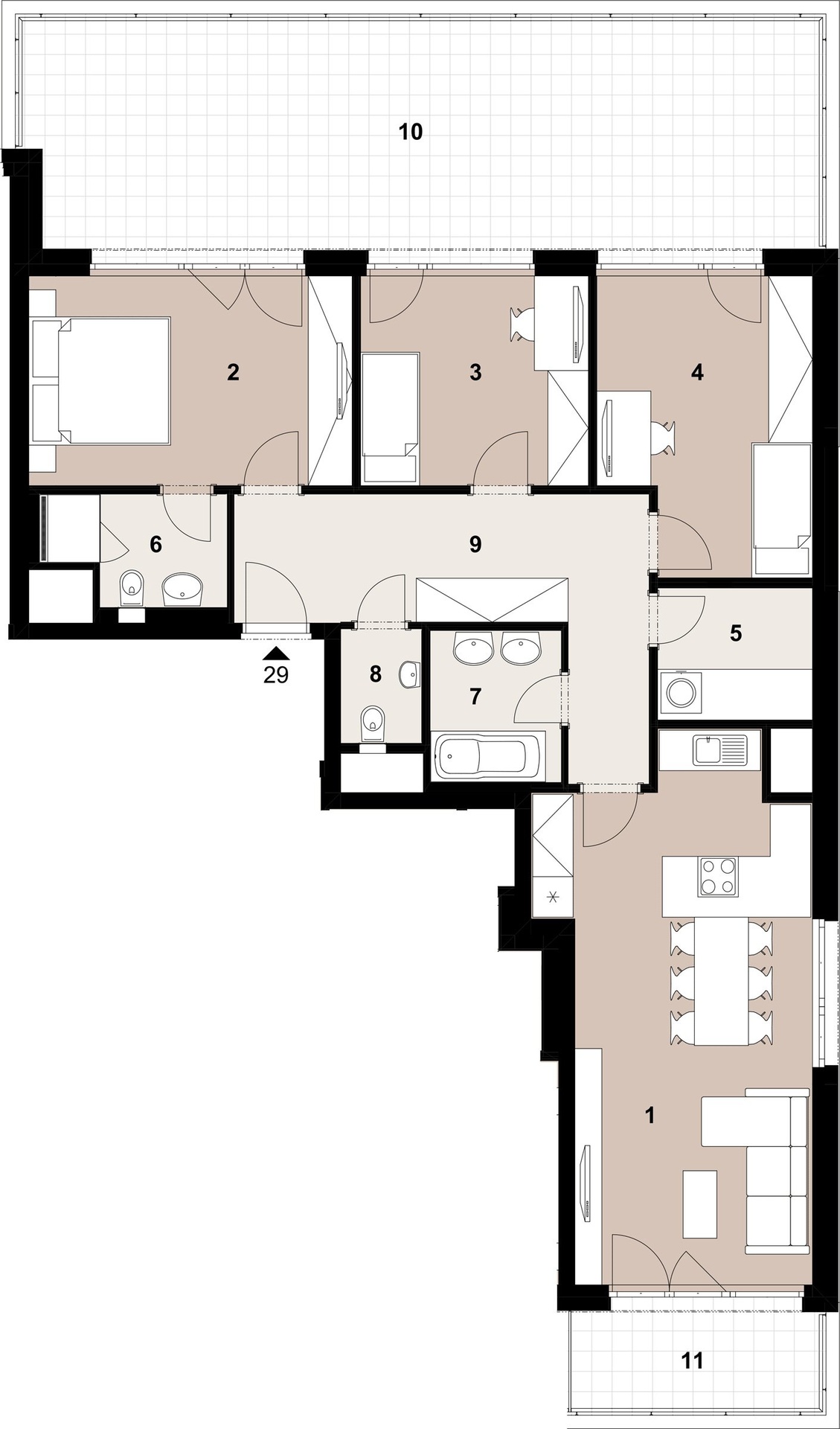 Nabízíme k prodeji byt 197-05-029 s dispozicí 4+kk (96,4 m2), terasou (49,6 m2), přiřazeným sklepem, parkovacím a garážovým stáním v novém projektu Viladomy Počernice v Praze 9 - Dolních Počernicích. Viladomy Počernice se nacházejí v klidné vilové čtvrti Prahy 9 - Dolní Počernice, nedaleko Velkého Počernického rybníku, který je spolu s přilehlým zámeckým parkem přírodní památkou. V osmi moderních nízkopodlažních viladomech vznikne celkem 164 bytů s promyšlenými a efektivními dispozicemi 1+kk až 4+kk. Na své si přijdou nejen rodiny s dětmi, ale i singles a mladé páry. Všechny byty mají balkony, lodžie, terasy nebo prostorné předzahrádky a parkovací stání. Byty v nejvyšších patrech jsou vybaveny klimatizací a mají předokenní žaluzie. Parkovací stání a sklepy nejsou zahrnuty v ceně z důvodu snadnějšího a přehlednějšího porovnání napříč nabídkou na trhu nového bydlení.