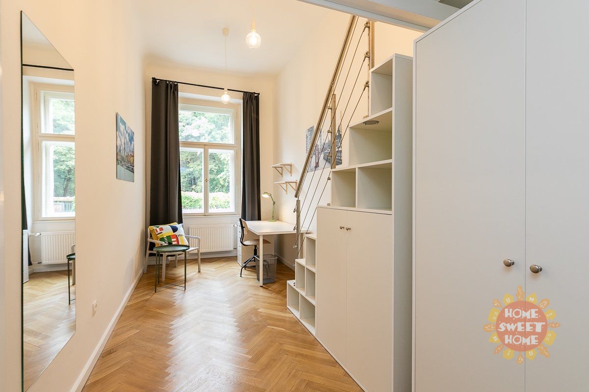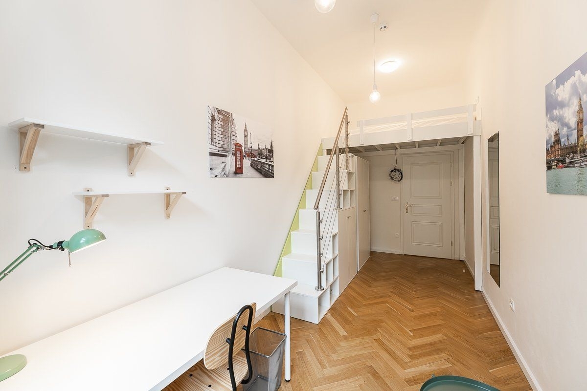 Nabízíme krásný, plně zařízený pokoj o velikosti 12 m2 s patrem na spaní, který se nachází v 1. patře cihlového domu v rezidenci Kinských na náměstí Kinských, Praha 5. Dům prošel kompletní rekonstrukcí v roce 2019. Pokoj je součástí čtyřpokojového bytu s plně vybavenou kuchyní, jídelním koutem, dvěma koupelnami a samostatnou toaletou. Společné prostory jsou kompletně vybaveny včetně žehličky, úklidových pomůcek a dalších potřeb pro běžný provoz. Samotný uzamykatelný pokoj je vybavený pracovním stolem, šatní skříní, přikrývkou a polštářem. Internet a úklid společných prostor (1× týdně) jsou již zahrnuty v ceně nájmu. Nájemníkům je dále k dispozici fitness, prádelna (na mince) a společná terasa. Rezidence se nachází ve velmi oblíbené lokalitě v těsné blízkosti centra města, nedaleko zahrady Kinských a parku Petřín. V okolí je vynikající občanská vybavenost - obchodní centrum Anděl, Cinema City Nový Smíchov, školy, restaurace, bary a mnoho dalšího. Rovněž dopravní dostupnost je výborná: tramvajová zastávka Újezd (200 m), metro Anděl (10 minut chůze) nebo vlakové nádraží Praha-Smíchov (5 zastávek tramvají). Bydlení je vhodné především pro studenty na střednědobý pronájem. Pokoj je volný od začátku ledna 2026.