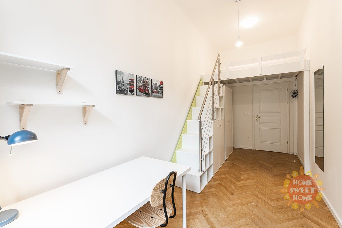 Nabízíme krásný, plně zařízený pokoj o velikosti 14 m2 s patrem na spaní, který se nachází v 1. patře cihlového domu v rezidenci Kinských na náměstí Kinských, Praha 5. Dům prošel kompletní rekonstrukcí v roce 2019. Pokoj je součástí čtyřpokojového bytu s plně vybavenou kuchyní, jídelním koutem, dvěma koupelnami a samostatnou toaletou. Společné prostory jsou kompletně vybaveny včetně žehličky, úklidových pomůcek a dalších potřeb pro běžný provoz. Samotný uzamykatelný pokoj je vybavený pracovním stolem, šatní skříní, přikrývkou a polštářem. Internet a úklid společných prostor (1× týdně) jsou již zahrnuty v ceně nájmu. Nájemníkům je dále k dispozici fitness, prádelna (na mince) a společná terasa. Rezidence se nachází ve velmi oblíbené lokalitě v těsné blízkosti centra města, nedaleko zahrady Kinských a parku Petřín. V okolí je vynikající občanská vybavenost - obchodní centrum Anděl, Cinema City Nový Smíchov, školy, restaurace, bary a mnoho dalšího. Rovněž dopravní dostupnost je výborná: tramvajová zastávka Újezd (200 m), metro Anděl (10 minut chůze) nebo vlakové nádraží Praha-Smíchov (5 zastávek tramvají). Bydlení je vhodné především pro studenty na střednědobý pronájem.Pokoj je volný od 4.února 2026.