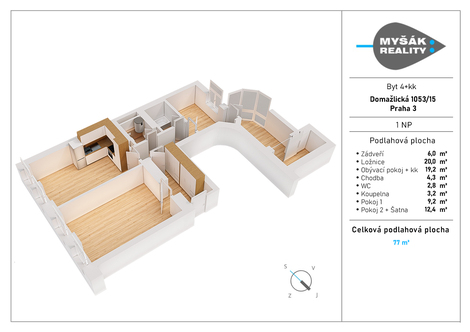 Byt v OV, který si vás získá hned při prvním vstupu: promyšlená dispozice 4+kk (77 m2), kvalitní a nadčasová rekonstrukce, velkorysé úložné prostory a dokonale sladěné detaily. Bydlení, které spojuje charakter, funkčnost a každodenní komfort. Už od vstupu je znát, že byt je navržený tak, aby se v něm pohodlně žilo každý den. Velká okna vnášejí do prostoru spoustu přirozeného světla a rekuperace zajišťuje stálý přísun čerstvého vzduchu bez nutnosti častého větrání. Po levé straně bytu na vás čekají dva velké neprůchozí pokoje, každý o velikosti zhruba 20 m2. První slouží jako prostorný dětský pokoj, který díky své ploše bez problémů pojme herní i studijní část. Na něj navazuje obývací pokoj s kuchyňským koutem, vybavený kuchyňskou linkou na míru se všemi spotřebiči. Oba pokoje jsou orientované na východ do ulice Domažlická a působí světlým, příjemným dojmem. Zadní část bytu je orientovaná do klidného vnitrobloku a tvoří ji ložnice rodičů, ze které se vstupuje do samostatné místnosti, která může být zároveň pracovnou, šatnou i úložným prostorem. Díky šoupacím dveřím, připraveným rozvodům a chytře řešené komoře je tento prostor už teď plně připravený na jakékoli využití — kombinace home office a velkorysé rodinné šatny. Koupelna se nachází v prostřední části bytu a je samostatně oddělená od toalety. Oba prostory jsou příjemně velké a laděné v moderním, nadčasovém stylu. V koupelně najdete vanu se skleněnou zástěnou, takže si tu přijdou na své jak milovníci dlouhých koupelí, tak ti, kteří preferují rychlou sprchu. Komfort dodává podlahové vytápění. Toaleta je řešená jako jedna prostorná místnost, kde je už nyní připravené místo pro pračku a sušičku — vše je chytře navrženo tak, aby technické věci nepůsobily rušivě a zároveň byly prakticky po ruce. Součástí toalety je také bojler, který zajišťuje ohřev teplé vody, teplo zajišťuje domovní kotelna. Dům, ve kterém se byt nachází, prošel pečlivou a poctivou rekonstrukcí, zachoval si původní atmosféru i řadu detailů, jež byly při renovaci citlivě opraveny a zvýrazněny. Společné prostory působí upraveně a příjemně a celý dům má klidný, kultivovaný ráz. Díky své poloze na rohu ulice Domažlická působí bytový dům vzdušně a přirozeně zapadá do historického rytmu Žižkova. Žižkov už dávno není tou šedou čtvrtí, které se lidé vyhýbali. Dnes je to jedna z nejživějších a nejautentičtějších částí Prahy — plná barev, gastronomických překvapení a příjemných míst k posezení. V docházkové vzdálenosti máte Pražačku, Vítkov, Parukářku i tunel do Karlína — ideální pro běhání, večerní procházky nebo posezení s výhledem na město. Moderní i starý Žižkov se tu propojují přesně tak, jak mají: s energií, osobitostí a skvělou atmosférou, která dělá z každodenního života na tomto místě radost. Prohlídky možné kdykoliv. Zajistíme harmonický převod vlastnického práva k bytové jednotce a bezpečný převod kupní ceny - notářská či bankovní úschova dle výběru kupujícího.