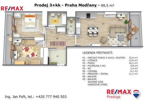 Nabízíme prodej bytu 3+kk o celkové podlahové ploše 93,8 m + dva balkóny, umístěného v posledním 5. nadzemním podlaží projektu Neo Riviera / Rezidence Modřanka. Byt se prodává pouze společně s garážovým stáním (550 000 Kč) a sklepní jednotkou (150 000 Kč). Byt se nachází ve fázi F, etapě C (objekty F10F13) v Praze 4 Modřanech. Je orientovaný na dvě světové strany a nabízí vstup na balkon z každé obytné místnosti. K dispozici jsou dva balkony o velikosti 8 m a 9 m, garážové parkovací místo a sklepní kóje o velikosti 4,3 m. Dispozice je řešena prakticky s oddělením denní a noční části. V bytě se nachází obývací pokoj s plně vybavenou kuchyňskou linkou (35,4 m), dvě ložnice orientované do klidné části areálu (16,1 m a 13,6 m), koupelna s vanou a toaletou (4,8 m), samostatná toaleta (2,4 m), předsíň s šatnou (11,1 m) a chodba s komorou (6,1 m). Součástí obytného souboru Neo Riviera / Rezidence Modřanka je upravený vnitroblok se zelení, dětským hřištěm a relaxačními zónami. Lokalita nabízí kompletní občanskou vybavenost školy, školky, obchody, restaurace i sportoviště. V pěší vzdálenosti se nachází tramvajové a autobusové zastávky, nedaleko také vlakové spojení. Okolí poskytuje přístup na cyklostezku podél Vltavy a do přírodního parku Modřanská rokle. Pro více informací a sjednání prohlídky mě neváhejte kontaktovat Prodávající si vyhrazuje právo vybrat kupujícího na základě jím zvolených kritérií. <a href="https://www.eurobydleni.cz/byty/3_1/karlovy-vary/obec-karlovy-vary/prodej/"><strong>Prodej bytu 3+1 Karlovy Vary</strong></a>
