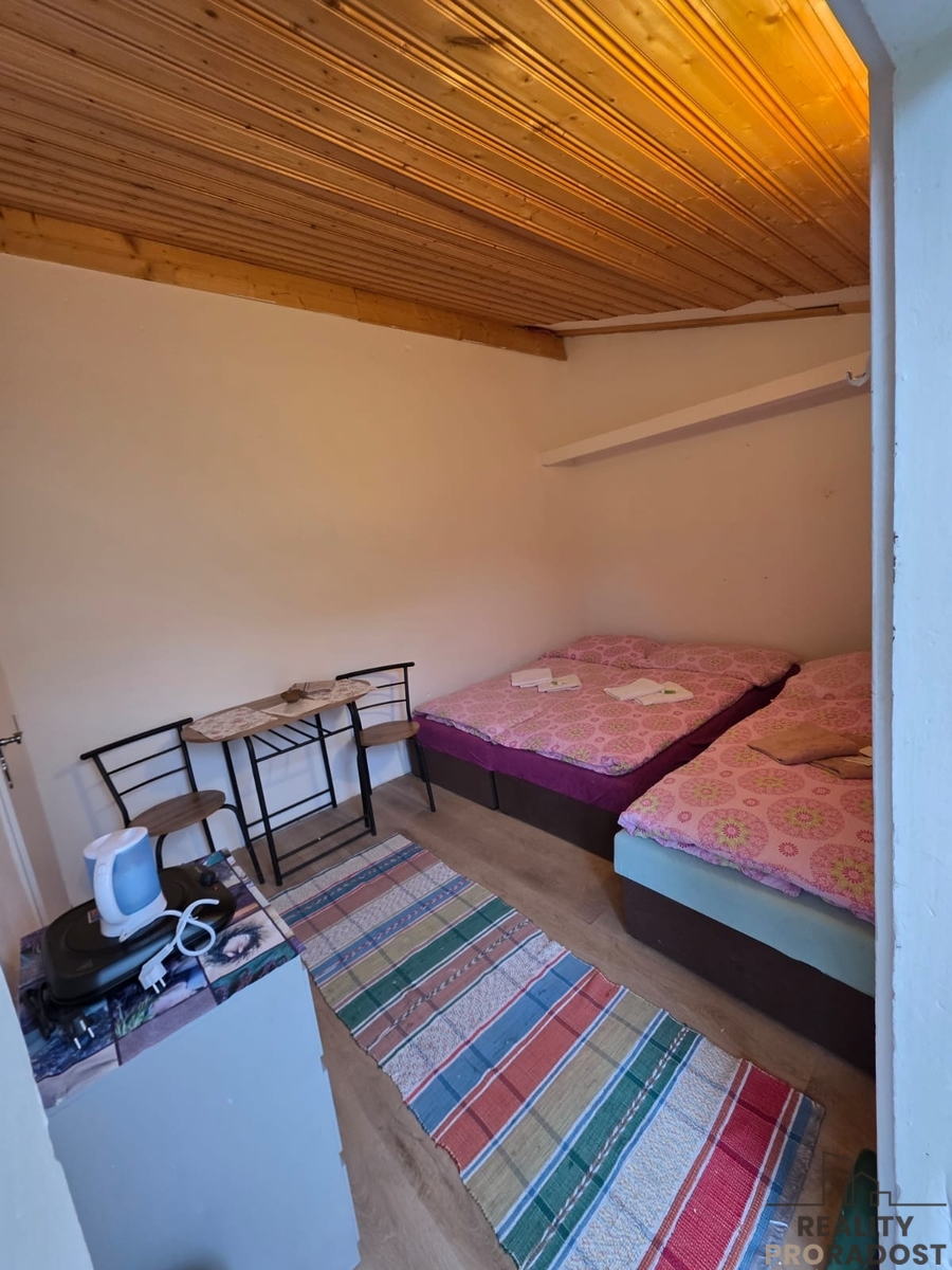 Nabízíme pronájem ubytovacích prostor, které se nachází v ul. Nečova, Praha 4 - Modřany. Prostory se skládají z několika staveb: - chatka - pravá část - 2 lůžka (13 m2) - chatka - levá část - 2 lůžka (12 m2) - srub - 2-3 lůžka (16 m2) - zadní domek - pravá část - 2-3 lůžka (13 m2) - zadní domek - levá část - 2 lůžka (12 m2) - karavan - 2 lůžka (12 m2) Vše je dispozičně jako 1+0, vybaveno vždy plotýnkou, minibarem, konvektorem, rychlovarnou konvicí. V objektu jsou dvě pračky, tedy v režimu prádelny, koupelna ke karavanu se používá sdíleně i jako 1 prádelna ze dvou. Zahrada je sdílená se všemi domky/chatkami. Wi-fi je k dispozici zdarma. Objekt se nachází v klidné lokalitě zástavby rodinných domů, v docházkové vzdálenosti se nachází autobusová zastávka, občanská vybavenost v okolí. Volné dle domluvy. Nájem vč. poplatků: 85.000,- Kč (cena za 1 lůžko 6.071,- Kč/měsíc) Elektřina: vyúčtování a platba každý měsíc dle skutečné spotřeby (7Kč/1KW) se slevou od majitele cca 50%. Kauce: 85.000,- Kč Provize RK Pro více informací nebo prohlídku nás neváhejte kontaktovat.