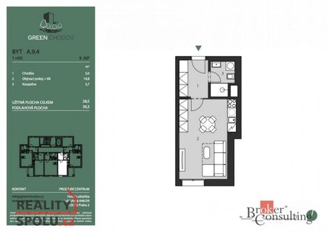 Představujeme vám rezidenční projekt Green Chodov spojení komfortního městského života s klidem přírody. Moderní architektura, vysoký standard a atraktivní lokalita dělají z Green Chodova jedinečné místo pro bydlení i investici. 5 důvodů proč Green Chodov Jaké jsou největší lákadla a co kupující milují nejvíc? Mimořádná lokalita pár minut chůze na metro Chodov či Roztyly, 2 autobusové zastávky přímo u domu, v budoucnu i plánovaná tramvajová trať. Vše po ruce Westfield Chodov, supermarket i veškerá občanská vybavenost v pěší dostupnosti. Harmonie s přírodou přímé napojení na park Trojmezí a přírodní jezírko pro relax i sport. Vysoký standard rekuperace ve všech jednotkách, klimatizace ve vyšších patrech, dřevěné podlahy, sádrové omítky, předokenní žaluzie a nadstandardní výška stropů min. 2,75 m. Pro každého od praktických 1+kk a 2+kk až po exkluzivní mezonety. Projekt Green Chodov se skládá z 11podlažního bytového domu a 2podlažního polyfunkčního domu se společným podzemním parkováním. Je ideální jak pro vlastní bydlení, tak i jako bezpečná investiční příležitost díky blízkosti metra, administrativních center a přírody. Projekt byl nominován na Realitní projekt roku 2025, což potvrzuje jeho výjimečnost a kvalitu. Exkluzivní nabídka poslední svého druhu Nabízená jednotka je poslední dostupný byt s dispozicí 1+kk a podlahové ploše 30 m v celém projektu. Jednotka se nachází v 9. nadzemním podlaží, což zajišťuje dostatek světla, klid a atraktivní výhled. Tento byt představuje ideální startovací bydlení pro jednotlivce či pár, zároveň však i vysoce likvidní investiční příležitost s dlouhodobým potenciálem. Kombinace vysokého patra, kompaktní dispozice a prémiové lokality z něj dělá mimořádně velmi žádaný typ nemovitosti. <a href="https://www.eurobydleni.cz/domy/rodinny-dum/praha-9/obec-ujezd-nad-lesy/prodej/"><strong>Prodej rodinného domu Praha 9, Újezd nad Lesy</strong></a>
