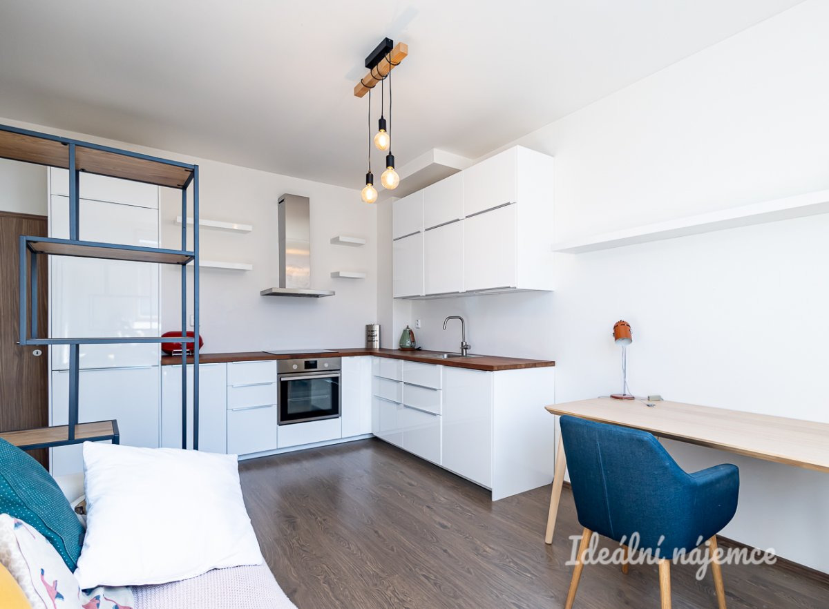 K dlouhodobému podnájmu Vám nabízíme velmi světlý, kompletně zařízený byt o dispozici 2kk se samostatnou sklepní kójí. Nachází se v 6. patře cihlového domu s výtahem, v nadstavbě domu dokončené v roce 2021. Byt se nabízí plně vybavený tak, jak vidíte na fotografií. Skládá se ze vstupní chodby s velkou šatní skříní se vstupem do koupelny. Ta je vybavena sprchovým koutem, umyvadlem a toaletou. Obývací pokoj, který je přímo napojený na kuchyň je zařízen pohovkou, pracovním stolem se židlí a regálovou policí. Kuchyně je vybavena všemi vestavnými spotřebiči - lednice, myčka, sklokeramická varná deska, trouba, digestoř a pračka. Samostatná ložnice je zařízena kompletní postelí, velkou šatní skříní a komodou. Byt se nachází ve velmi klidné lokalitě jednosměrné ulice Biskupcova. Tramvajová zastávka "Vozovna Žižkov" nebo "Ohrada" je od domu vzdálena necelých 300m. Přímo v ulici je také několik menších obchodů s potravinami nebo obchod LIDL, který je u tramvajové zastávky. Zálohové platby už obsahují zálohy na elektřinu a pojištění Byt je volný k nastěhování od 1.3.2026.