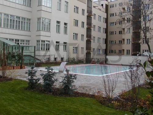 Luxusně zařízená garsonka k pronájmu, (48 m2) ve 3. patře s výtahem v prestižním klasickém secesním domě s vysokými stropy a originální výzdobou po kompletní rekonstrukci, která proběhla v roce 2006. Dům se nachází v rezidenční oblasti historického centra Prahy, jen 200 m od parku Riegrovy sady, 300 m od stanice metra trasy A Náměstí Míru, park Riegrovy sady kousek od domu a 500 m od Václavského náměstí stanice metra Muzeum trasy (A) a (C) a nákupního a kulturního centra Prahy. Byt je kompletně zařízen pseudostarožitným italským nábytkem. Byt sestává z obývací pokoj 21 m2, s kuchyňským koutem vybaveným lednicí s mrazákem, myčkou, plynovým sporákem, digestoří, koupelna s umyvadlem, rohovou vanou, WC a bidetem. Byt má telefonní linku, rychlý internet, TV, satelit, na podlahách parkety a dlažba, při rekonstrukci byly použity nadstandardní materiály. V domě jsou vybudovány podzemní garáže, výtah, na dvoře domu je velký bazén 8 x 11 m hluboký 1,2 metru s hydromasážním koutem, obklopený terasou a zelení. V domě je také kamerový systém, ostraha a správce. Garážové stání, ostraha a používání bazénu v ceně.