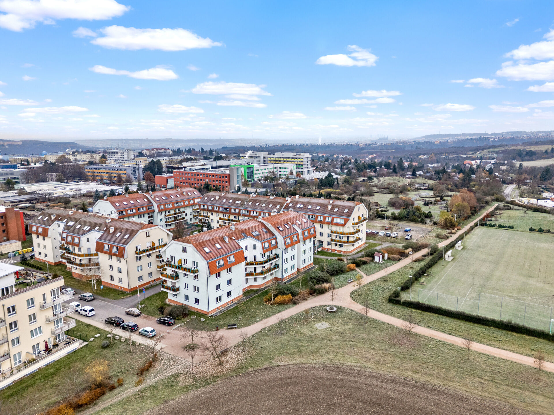 Nabízíme velmi pěkný nebytový prostor o velikosti 64 m2, v suterénu bytového domu od společnosti EKOSPOL, vhodný i k přechodnému bydlení. Jedná se o dvě nebytové jednotky o velikosti 45 m2 a 19 m2, spojené v jednu, se vstupem přes zabezpečenou sdílenou chodbu s vedlejším menším nebytovým prostorem, využívaným jen jednou osobou jako občasná kancelář. Nebytový prostor se nachází v klidné ulici K Horoměřicům, v Praze 6 - Suchdol, s velkým parkovištěm přímo za domem. Součástí prodeje je plně vybavená kuchyňka a veškeré vybavení viditelné na fotografiích. K prostoru je zaveden přívod elektřiny, vody i odpad, součástí jsou vlastní elektroměr a vodoměr, což umožňuje nezávislé měření a účtování spotřeby. Vytápění a ohřev teplé vody je zajištěno centrálně. Měsíční předpis 2900,- Kč (fond oprav, úklid, vodné stočné, teplo, společná elektřina, pravidelná údržba, pojištění), elektřina cca 800,- Kč/měsíc. Pouhé 2 minuty pěšky je vzdálena stanice autobusu se spojením na metro A Dejvická a areál České zemědělské univerzity s plaveckým bazénem a dalšími sportovišti. V okolí je kompletní občanská vybavenost (MŠ, ZŠ, obchody, služby, restaurace, kulturní i sportovní vyžití). Přímo od domu vedou cyklostezky do přírodních parků Šárka - Lysolaje nebo Housle a i do krásné přírodní rezervace Údolí Únětického potoka.