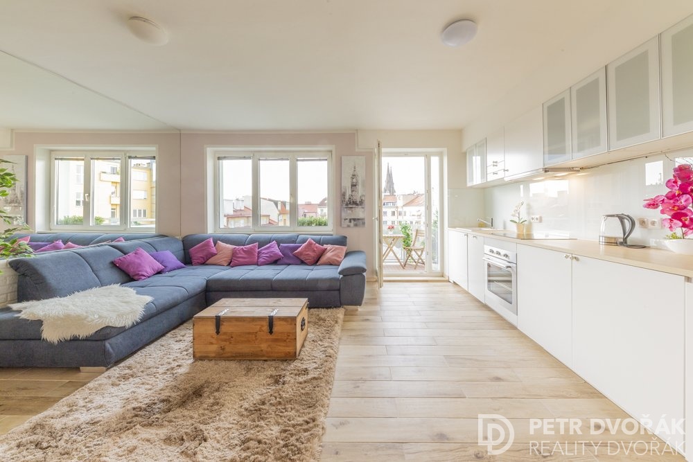 Nabízíme k pronájmu elegantní byt 3+kk s balkonem o celkové ploše 98 m2, situovaný ve 7. nadzemním podlaží udržovaného činžovního domu s výtahem v prestižní lokalitě Královských Vinohrad, v ulici Uruguayská, Praha 2. Byt je k nastěhování dle domluvy, prakticky ihned. Interiér bytu tvoří prostorný obývací pokoj s plně vybavenou kuchyní, ze kterého je vstup na balkon s otevřenými výhledy na okolní zástavbu Vinohrad, včetně ikonických věží chrámu sv. Ludmily na Náměstí Míru. Dispozici dále doplňují dvě samostatné ložnice, koupelna s vanou, samostatná toaleta a vstupní hala. Byt je prakticky orientován - ložnice na jihovýchod, obytná část s kuchyní na severozápad, což zajišťuje dostatek denního světla po celý den. Nemovitost prošla kompletní rekonstrukcí v roce 2018, zahrnující nové rozvody elektřiny, vody a odpadů, nové omítky a repasované dřevěné podlahy. Byt je nabízen kompletně zařízený. Kuchyňská linka je vybavena vestavnými spotřebiči (sklokeramická varná deska, elektrická trouba, myčka, lednice, digestoř). Součástí vybavení je také pračka. Obytný prostor doplňuje sedací souprava a jídelní stůl, v ložnicích jsou manželské postele, šatní skříně budou instalovány. V bytě jsou bezpečnostní vstupní dveře, k dispozici je vysokorychlostní internet. Vytápění je zajištěno centrální domovní kotelnou. Dům je ve velmi dobrém technickém stavu. Velká okna podtrhují vzdušnost interiéru a poskytují příjemné výhledy do okolí. Lokalita Královských Vinohrad patří dlouhodobě k nejžádanějším rezidenčním adresám v Praze. Nabízí výbornou dostupnost do centra města, stanici metra A - Náměstí Míru i několik tramvajových linek v docházkové vzdálenosti. V okolí se nachází široká nabídka restaurací, kaváren, lokálních obchodů i kulturních institucí. Relaxaci v zeleni umožňují Riegrovy sady a Havlíčkovy sady. Byt je vhodný pro klienty hledající kvalitní bydlení v klidném prostředí prestižní městské čtvrti, s výbornou dostupností a vysokým standardem. Pro více informací nebo sjednání prohlídky kontaktujte realitního makléře.