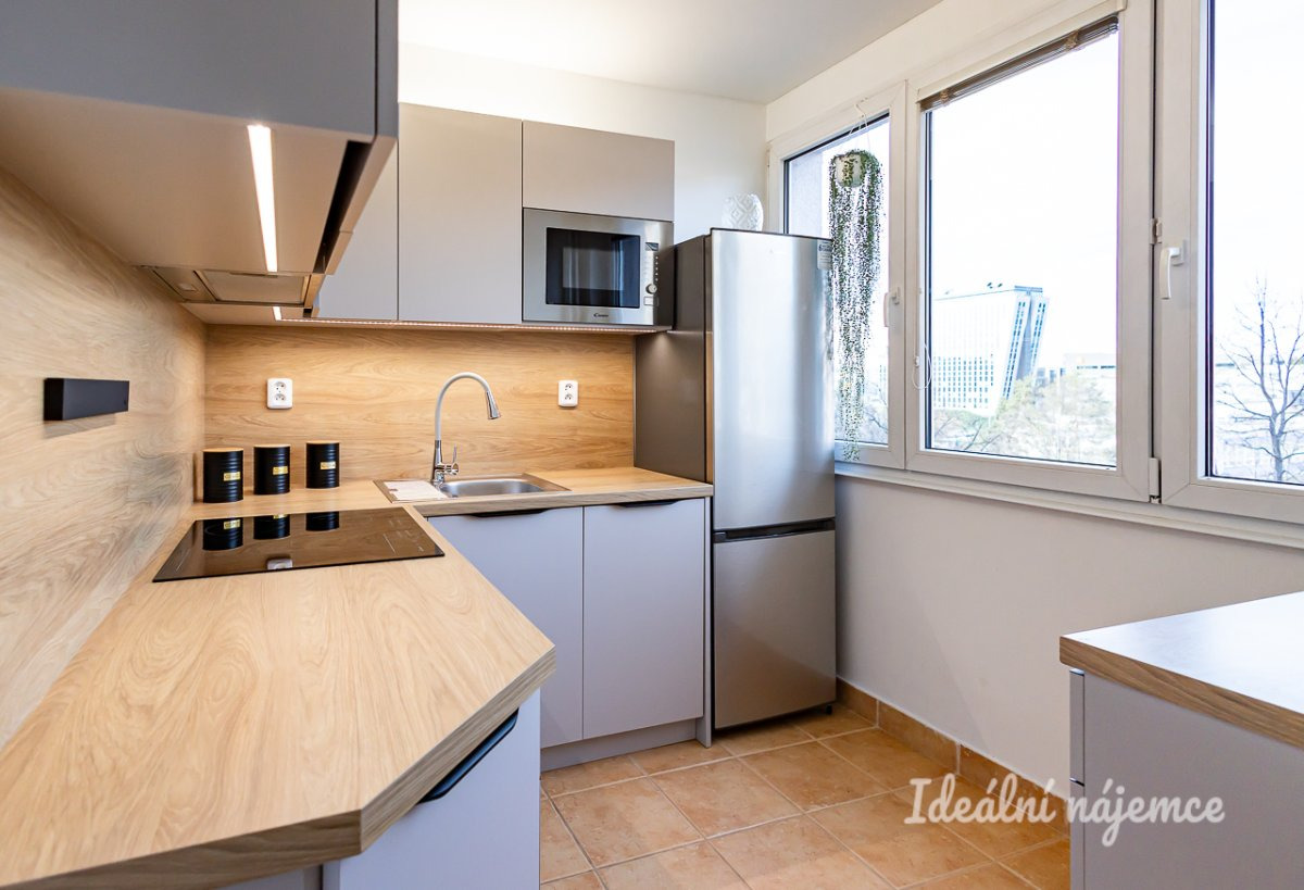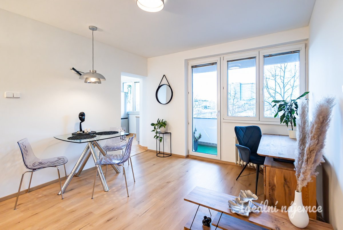 K dlouhodobému podnájmu nabízíme moderně zrekonstruovaný, ve vysokém standardu plně zařízený byt 2+1 s velkou lodžií orientovanou do vnitrobloku ve 3. patře udržovaného cihlového domu. Dům se nachází v klidné, a přesto dopravně perfektně dostupné lokalitě s vysokou kvalitou bydlení, nedaleko Pankráce, který je od domu jednu stanici metra. Pouhých 300m od od domu je vzdálena stanice metra C - Budějovická, kde je také OC DBK. Přímo před domem je také autobusová zastávka, ze které se za 12 minut jízdy autobusem dopravíte na Smíchovské nádraží nebo za minutu jízdy autobusem v Business Centru "Brumlovka". Byt s výměrou 49m2 tvoří vstupní chodba s nadstandartním množstvím úložného prostoru. Obývací pokoj se vstupem na velmi prostornou lodžii napojený na kuchyňský kout. Kuchyně vyrobena na míru je zařízena všemi vestavnými spotřebiči zn. Candy - vestavná trouba, indukční deska, mikrovlnná trouba, odtahová digestoř, myčka a volně stojící lednice. Na obývací pokoj navazuje ložnice vybavena velkou vestavnou šatní skříní, volně stojící skříní prostornou komodou a kompletní postelí. Zálohové platby už obsahují zálohy na elektřinu a pojištění domácnosti. Byt bude připraven k nastěhování od 01.10.2025