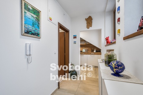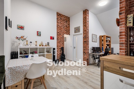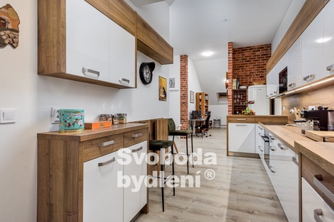 Dovolujeme si vám exkluzivně nabídnout ke koupi zajímavý a luxusně upravený podkrovní byt, nacházející se ve 3. patře cihlového domu s výtahem, ulice Prosecká. Mezi největší výhody patří kompletní působivá rekonstrukce a vybavení i lokalita obklopující zeleně a orientace některých oken s výhledem do vzrostlých stromů. Vstupní dveře bytu vedou do prostorné předsíně (cca 4,5m2) s dostatkem místa pro věšák a botník. Po levé straně nalezneme koupelnu se sprchovým koutem a toaletou. Předsíní pokračujeme do obývacích prostor s kuchyňským koutem (cca 42m2), jež jsou promyšleně a citlivě prakticky děleny na jednotlivé zóny. Po pravé straně je instalována kuchyňská linka se všemi spotřebiči (vestavná myčka, indukční varná deska, trouba, digestoř s odtahem do komína, samostatně stojící lednice, pračka a sušička jsou umístěny skrytě ve skříni). Na protější stěně je umístěn vyklápěcí stolek se židlemi. Navazující obývací prostor nabízí nyní klidovou (po oddělení příčkou by vznikla samostatná místnost, viz původní orientační plánek) a jídelní část. Odsud vcházíme do dveřmi oddělené ložnice (cca 13,4m2) a praktické šatny. Celý byt navozuje útulnou a stylovou atmosférou díky citlivé a praktické promyšlené rekonstrukci včetně jeho současného vybavení, jež je možné v bytě ponechat. Plastová okna v dekoru zlatého dubu jsou s izolačním trojklem, střešní okna Velux jsou opatřena protislunečními roletkami. Celková podlahová plocha bytu je 64,2m2 plus komora 2,3m2 na stejném podlaží u výtahu. Byt je pečlivě udržovaný a vkusně vybavený moderním nábytkem. Historie stavby cihlového domu dle dostupných informací z archivních plánů počíná již roku 1893. K původnímu stylu budovy (např. čelní fasáda) bylo přihlédnuto při její kompletní rekonstrukci a modernizaci, včetně všech bytových jednotek, dokončené roku 2020. Stavba byla např. zateplena, došlo k výměně oken a dveří, výměně technických instalací, střešní betonové krytiny Bramac, krovy jsou ocelovo-dřevěné, byla provedena přístavba výtahu a přístavba rampy pro bezbariérový přístup. Vytápění a ohřev vody je řešeno dvojicí plynových kondenzačních kotlů v kotelně v 1.PP domu. V domě lze využít společné prostory / kolárnu. Parkování je možné v okolních ulicích domu. Měsíční poplatky za bytovou jednotku činí 5.259,-Kč (včetně fondu oprav 1.926,-Kč) + elektřina v bytě. Byt je v osobním vlastnictví. Energetická třída C. Vlastník si vyhrazuje právo výběru lepší nabídky. V blízkosti bydlení nalezneme dostatek zeleně (např. přírodní památka Prosecké skály, cyklotrasy či naučná stezka podél Rokytky), v pěším dosahu je autobusová a tramvajová zastávka, vlaková stanice Vysočany je vzdálena cca 1,4km, metro trasy "B" a "C" cca 1,5km (cca 5min autobusem). Hledáte-li ojedinělý byt s působivou atmosférou, s možností okamžitého bydlení, dovoluji si Vám tuto výjimečnou nabídku jedině doporučit.