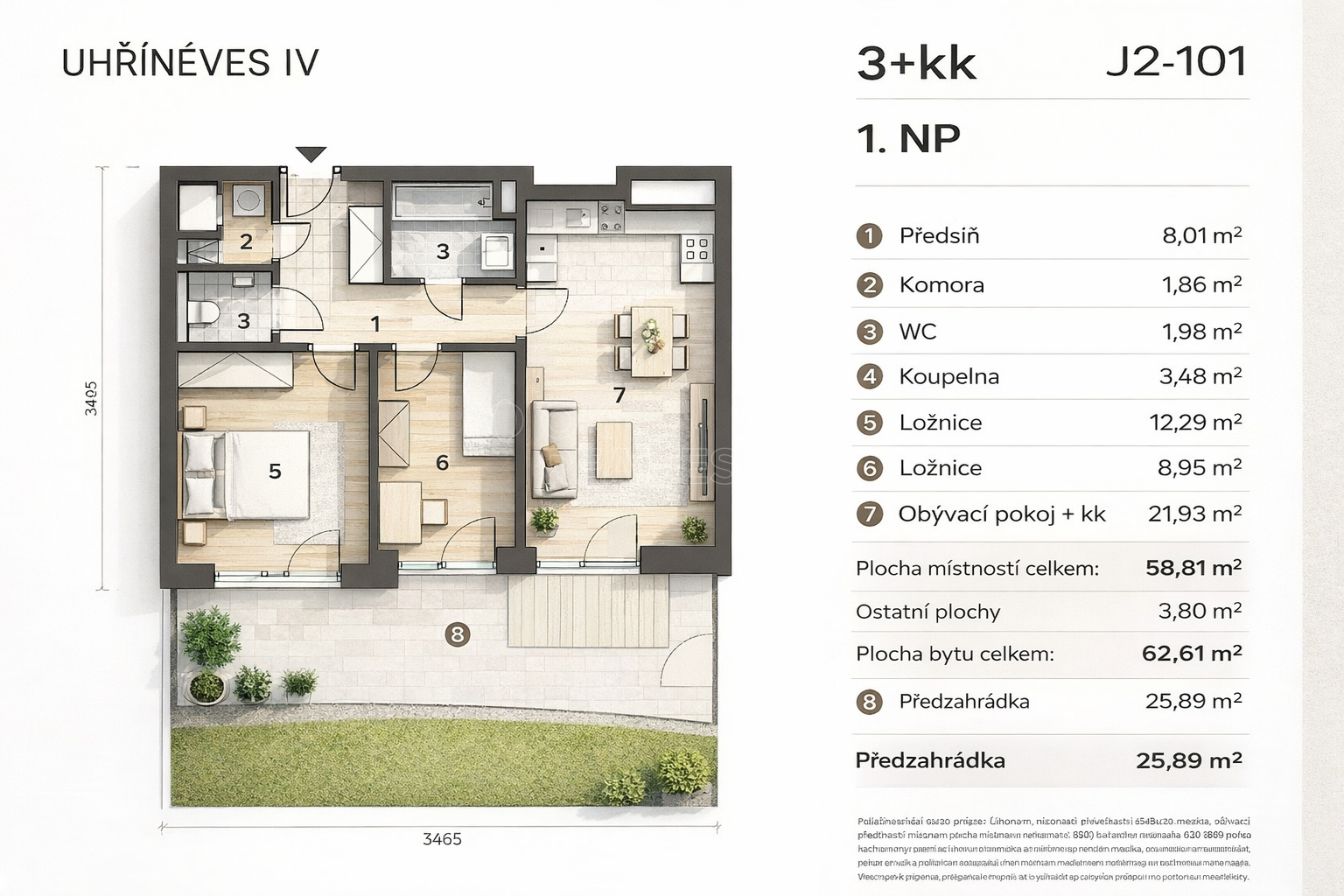 Nabízím ke koupi moderní byt o dispozici 3+kk s vlastní předzahrádkou a garážovým stáním v klidné a vyhledávané části Prahy - Uhříněves. Byt o celkové ploše 62,61 m2 se nachází v 1. nadzemním podlaží novostavby z roku 2019/2020 a zaujme především promyšlenou dispozicí, dostatkem světla díky orientaci na jihovýchod a nadstandardní světlou výškou stropů, která prostoru dodává vzdušnost a nabízí i možnost dalšího praktického využití (např. úložné patro). Dominantou bytu je obývací pokoj s kuchyňským koutem a přímým napojením na venkovní prostor. Velkým benefitem je vstup na předzahrádku z každého pokoje, což výrazně zvyšuje komfort bydlení a propojení interiéru s exteriérem. Kuchyňská linka je zhotovena na míru včetně vestavěných spotřebičů. V bytě je dostatek úložných prostor díky vestavěným skříním. Dispozice dále nabízí dvě samostatné ložnice, koupelnu, samostatné WC a praktickou technickou místnost vhodnou pro pračku i sušičku. Předzahrádka o výměře 25,89 m2 poskytuje příjemné soukromí a prostor pro relaxaci či posezení. Součástí prodeje je také garážové stání v protějším domě, navíc s rozšířeným prostorem vhodným například pro motocykl. Energetická náročnost budovy je třídy C - úsporná. Velkou výhodou lokality je kompletní občanská vybavenost, dostatek zeleně a velmi dobrá dopravní dostupnost - vlakové spojení z Uhříněvsi umožňuje rychlé spojení do centra Prahy. Měsíční náklady na bydlení činí cca 6.000 Kč + elektřina. Byt je v osobním vlastnictví a lze jej financovat hypotečním úvěrem, se kterým vám rádi pomůžeme.