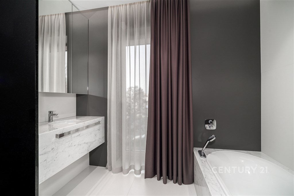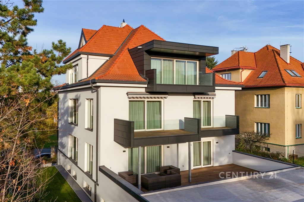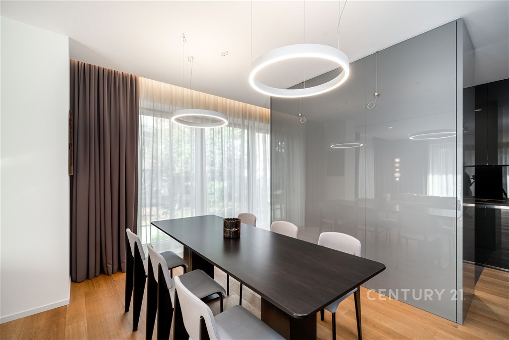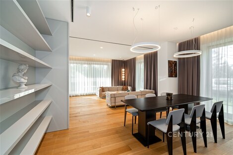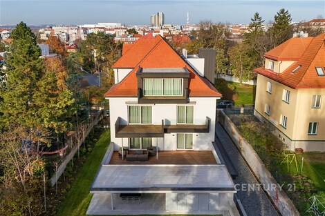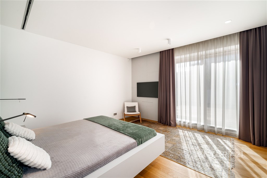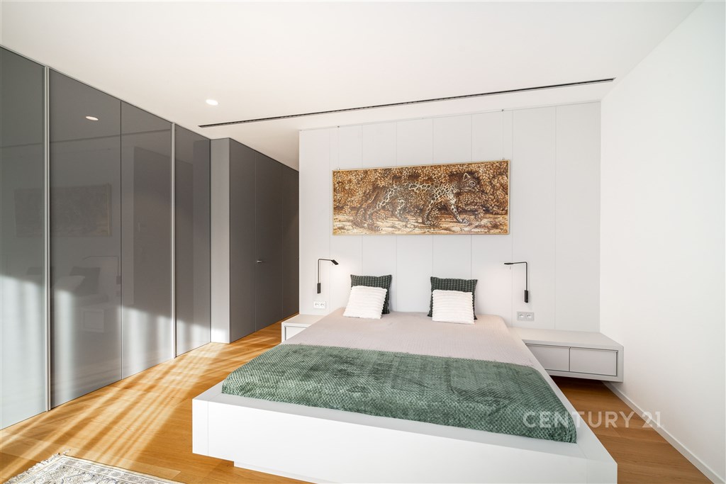 Nabízíme k pronájmu výjimečný byt o dispozici 3+kk s terasou, který se nachází ve 2. nadzemním podlaží zrekonstruované vily v jedné z nejžádanějších rezidenčních lokalit Prahy - Podolí. Byt nabízí celkovou plochu 137m2 a je doplněn o prostornou terasu o velikosti 63m2, která poskytuje ideální prostor pro venkovní posezení a relaxaci. Interiér bytu byl navržen renomovaným českým architektem Radanem Hubičkou, který je známý svou schopností maximálně využít prostor a elegantně integrovat úložné prvky tak, aby zůstaly vizuálně čisté a téměř neviditelné. Soukromí, komfort, funkčnost a nadčasový design jsou hlavními atributy tohoto bydlení. Vstup do bytu tvoří velkorysé zádveří s integrovanými vestavěnými úložnými systémy, které jsou citlivě zapracované do stěn a vytvářejí minimalistický a nerušivý prostor. Na zádveří navazuje hlavní obytná část, která propojuje obývací pokoj, jídelnu a kuchyni. Prostor je díky velkoformátovým posuvným oknům krásně prosvětlený a nabízí přímý vstup na terasu. Kuchyň je navržena jako samostatně vnímaný celek - je částečně oddělena subtilní obcházející stěnou, která zachovává otevřenost prostoru, ale zároveň eliminuje přímý pohled na pracovní část kuchyně z obývací zóny. Samozřejmostí jsou prémiové spotřebiče značky Miele. Hlavní ložnice nabízí maximální komfort a soukromí - disponuje vlastní šatnou, ensuite koupelnou a přímým vstupem na terasu, který přirozeně propojuje interiér s venkovním prostorem. Druhá ložnice je situována v klidové části bytu a má k dispozici druhou koupelnu, která je přístupná ze zádveří. Součástí bytu je také samostatná místnost pro praní a úklid, vybavená pračkou a sušičkou, která zároveň poskytuje praktický úložný prostor. K bytu náleží 1 garážové stání. Rezidenti mohou využívat také společnou zahradu o výměře 1 099m2, která nabízí prostor pro relaxaci i společenská setkání, včetně venkovního posezení, grilovací zóny a venkovní kuchyně. Podolí patří mezi nejvyhledávanější vilové čtvrti Prahy, nabízí klidné bydlení v zeleni a zároveň výbornou dostupnost do centra města. Tento byt je ideální pro klienty hledající reprezentativní bydlení s důrazem na architekturu, detail a kvalitní design.