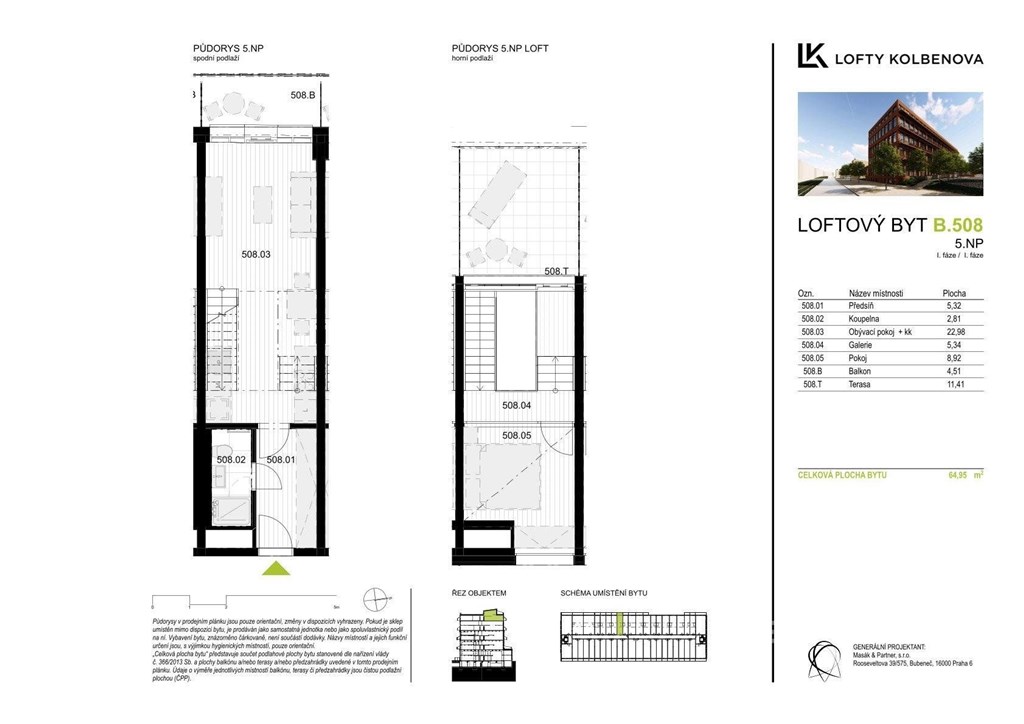 V zastoupení developera nabízíme k prodeji loftový byt 2+kk s balkonem (4 m2) a terasou (11 m2) s velkolepým výhledem na Prahu. Byt je orientovaný na západní stranu, takže v jarních a letních měsících si tak můžete vychutnávat posezení se sklenkou dobrého vína při západech slunce nad krásnou Prahou. Pro větší komfort je byt vybaven klimatizací, rekuperací, elektrožaluziemi a podlahovým topením. K bytu je možné přikoupit garážové zakladačové parkovací stání za 495 000 Kč. Tento developerský projekt získal ocenění jako uznání za nejlepší stavbu využívající stávající objekt v bývalé průmyslové lokalitě. Jedná se o objekt, který díky revitalizaci a rekonstrukci bývalé továrny ČKD se proměnil v moderní designové bydlení. Developer do 3. patra v bytech zachoval původní prvky z továrny, jako jsou například trámy a krakorce. Od 4. patra se jedná o novostavbu. V projektu můžeme najít byty od 1+kk až po 6+kk. Skvělá dopravní dostupnost, kde se před domem nachází zastávka tramvaje a metro Kolbenova 300 m od objektu. Přímo naproti je komplex Pragovka, nabízející jak kulturní, sportovní, tak kulinářské vyžití. Skoro za rohem se nacházejí obchodní centra jako Fénix a Galerie Harfa. Pro fanoušky sportovních zápasů a velkých koncertů ideální bydlení v blízkosti O2 arény a zároveň v blízkosti přírody jako Klíčovské sady. Byt je k dispozici ihned, pro více informací o objektu a jiných dispozic bytů/ateliérů přímo od developera mě prosím kontaktujte.