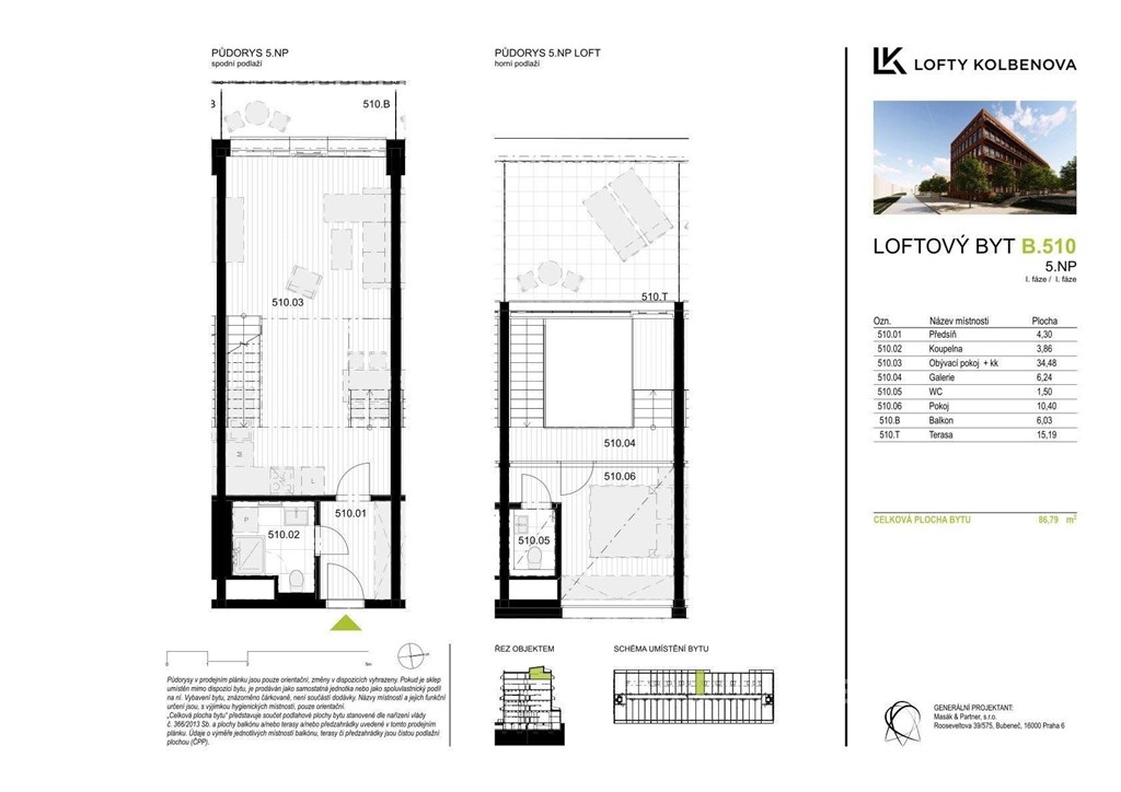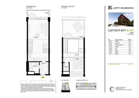 V zastoupení developera nabízíme k prodeji loftový byt 2+kk s balkonem (6 m2) a terasou (15 m2) s velkolepým výhledem na Prahu. Byt je orientovaný na západní stranu, takže v jarních a letních měsících si tak můžete vychutnávat posezení se sklenkou dobrého vína při západech slunce nad krásnou Prahou. V bytě se nachází v dolním patře koupelna s toaletou a v horním patře samostatná toaleta. Pro větší komfort je byt vybaven klimatizací, rekuperací, elektrožaluziemi a podlahovým topením. K bytu je možné přikoupit garážové parkovací stání za 595 000 Kč a sklep za 199 500 Kč. Tento developerský projekt získal ocenění jako uznání za nejlepší stavbu využívající stávající objekt v bývalé průmyslové lokalitě. Jedná se o objekt, který díky revitalizaci a rekonstrukci bývalé továrny ČKD se proměnil v moderní designové bydlení. Developer do 3. patra v bytech zachoval původní prvky z továrny, jako jsou například trámy a krakorce. Od 4. patra se jedná o novostavbu. V projektu můžeme najít byty od 1+kk až po 6+kk. Skvělá dopravní dostupnost, kde se před domem nachází zastávka tramvaje a metro Kolbenova 300 m od objektu. Přímo naproti je komplex Pragovka, nabízející jak kulturní, sportovní, tak kulinářské vyžití. Skoro za rohem se nacházejí obchodní centra jako Fénix a Galerie Harfa. Pro fanoušky sportovních zápasů a velkých koncertů ideální bydlení v blízkosti O2 arény a zároveň v blízkosti přírody jako Klíčovské sady. Byt je k dispozici ihned, pro více informací o objektu a jiných dispozic bytů/ateliérů přímo od developera mě prosím kontaktujte.