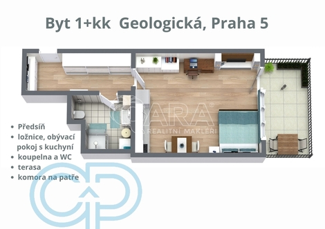 V zastoupení vlastníků nabízím k prodeji velmi příjemný byt o dispozici 1+kk (39,6 m2) s terasou 9m2 orientovanou do dvora. Nachází se v ulici Geologická, uprostřed klidné a vyhledávané části pražského Barrandova. Byt se nachází v rezidenčním projektu z roku 2012. Tento byt vás překvapí svou atmosférou hned při první návštěvě. Jeho hlavním kouzlem je propojení interiéru s venkovním prostorem. Z obytné místnosti můžete vstoupit přímo na terasu s vlastní zahrádkou, která vytváří tiché, zelené útočiště uprostřed města. Ideální místo na ranní kávu, večerní sklenku vína, drobné zahradničení a odpočinek na čerstvém vzduchu. Jednotka, která prošla tento měsíc revitalizací, se nachází ve zvýšeném přízemí. Stejně jako prostorná komora, která je praktickým bonusem pro budoucí majitele, kteří díky ní budou mít dostatek úložného prostoru. Čeká na Vás moderní, útulné bydlení bez dalších starostí - stačí jen vzít si kartáček na zuby a nastěhovat se. Byt je ideální volbou pro jednotlivce či pár - kdo hledá klidné bydlení s venkovním prostorem, ale zároveň ocení městský komfort. Stejně tak se jednotka nabízí jako možná investice - o podobné byty je v této lokalitě dlouhodobě velký zájem. Barrandov je moderní sídliště, kde je většina služeb koncentrovaná kolem Tilleho náměstí a Geologické ulice. Najdete zde vše, co ke komfortnímu životu potřebujete. Snoubí se zde klidné bydlení s rychlou dostupností do centra i na výpadovky, což z lokality dělá skvělé místo pro život. Občanská vybavenost - Lidl, Billa stop & shop, Minimarket Geologická, v blízkém okolí i Kaufland nebo Tesco. - Nespočet škol a školek v přilehlém okolí. - Lékárny, zdravotnická zařízení, nedaleká Nemocnice Motol. - Banky, bankomaty, pošta, drobné služby (kadeřnictví, trafiky apod.) - Restaurace, kavárny a bistra Volný čas a okolí - blízkost přírody (Prokopské údolí - cca 10-15 min) - dětská hřiště mezi domy - cyklostezky - sportovní centra Doprava - tramvajová trať, autobusy (rychlé spojení na Smíchov/centrum) - dobrá dostupnost autem (Barrandovský most a výpadovky) Pokud vás byt zaujal, neváhejte se ozvat a domluvte si prohlídku! Budu se na vás těšit!