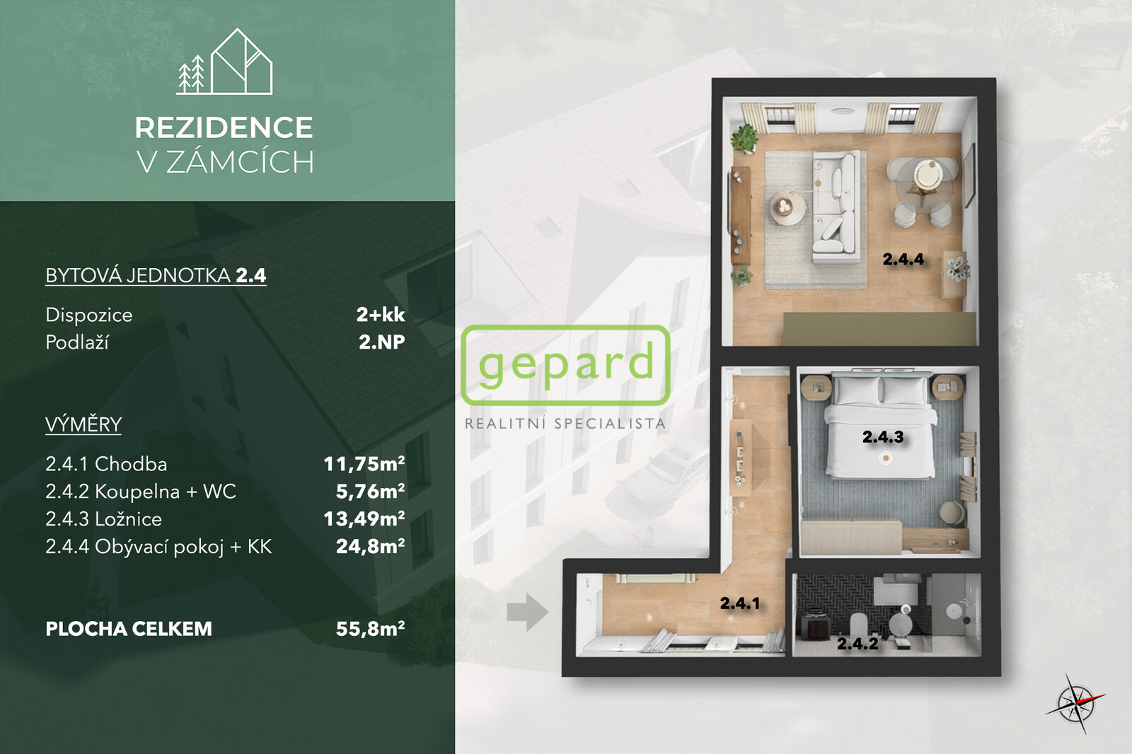 Nízkoenergetický byt (57,2 m2) o dispozici 2+kk v projektu Rezidence V Zámcích, Praha 8, je nyní k prodeji! Dokončení stavebních prací bude v únoru 2026, ale prohlídky jsou možné již teď. Byt se nachází ve 2. nadzemním podlaží a disponuje vstupní halou, odkud se vchází do dalších místností: obývacího pokoje, ložnice a koupelny s WC. Obývací pokoj je orientovaný na jihozápadní stranu a nabízí dech beroucí výhled na řeku a přírodu. V koupelně se nachází místo pro pračku i sušičku, závěsné WC a sprchový kout. Ložnice nabízí celou stěnu pro případné vložení vestavěné skříně pro maximalizaci úložného prostoru. V celém bytě najdete podlahové vytápění, což spolu s tepelným čerpadlem zaručuje nízké náklady na provoz bytu. Pro případné zvýšení komfortu je udělána příprava na klimatizaci. K bytu lze dokoupit sklep a parkovací stání. Rezidence V Zámcích je výjimečný komorní projekt o pouhých 10 bytových jednotkách, který spojuje městské bydlení s přírodou. PRVNÍ TŘI PRODANÉ BYTY MAJÍ SKLEP ZDARMA! Pro více informací či při zájmu o prohlídku mě prosím neváhejte kontaktovat.