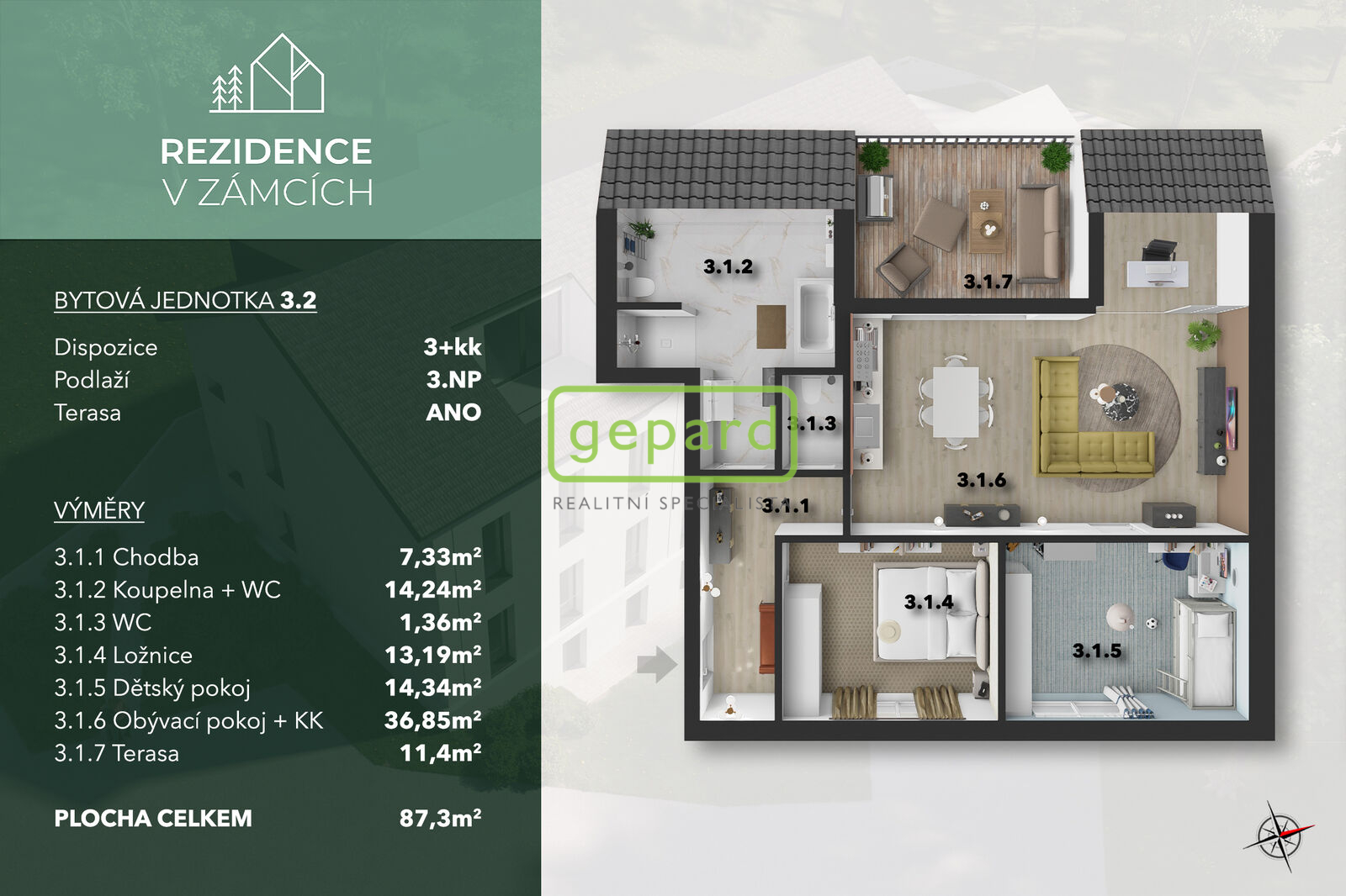 Nízkoenergetický byt (89,9 m2) s terasou (11,5 m2) v projektu Rezidence V Zámcích, Praha 8 je nyní k prodeji! Byt se nachází v posledním 3. nadzemním podlaží a disponuje vstupní halou, odkud se vchází do dalších místností: obývací pokoj, ložnice, koupelna, a oddělené WC. Z obývacího pokoje je vstup do 2. ložnice a také na terasu, která nabízí dech beroucí výhled na řeku a přírodu. V celém bytě najdete mnoho nadstandardních prvků, jako je např. klimatizace a podlahové vytápění, což zaručuje spolu s tepelným čerpadlem velmi nízké náklady na provoz bytu. V koupelně se nachází místo pro pračku i sušičku, závěsné WC, vana a sprchový kout. Obě ložnice a předsíň pak nabízejí celou stěnu pro případné vložení vestavěné skříně pro maximalizaci úložného prostoru. K bytu lze dokoupit sklep a parkovací stání. Rezidence V Zámcích je výjimečný komorní projekt o pouhých 10 bytových jednotkách, který spojuje městské bydlení v přírodě. První tři prodané byty mají sklep zdarma! Vizualizace a video odpovídají půdorysu této bytové jednotky. Fotografie jsou pořízeny ve vzorové bytové jednotce Rezidence V Zámcích. Pro více informací či při zájmu o prohlídku mě prosím neváhejte kontaktovat.