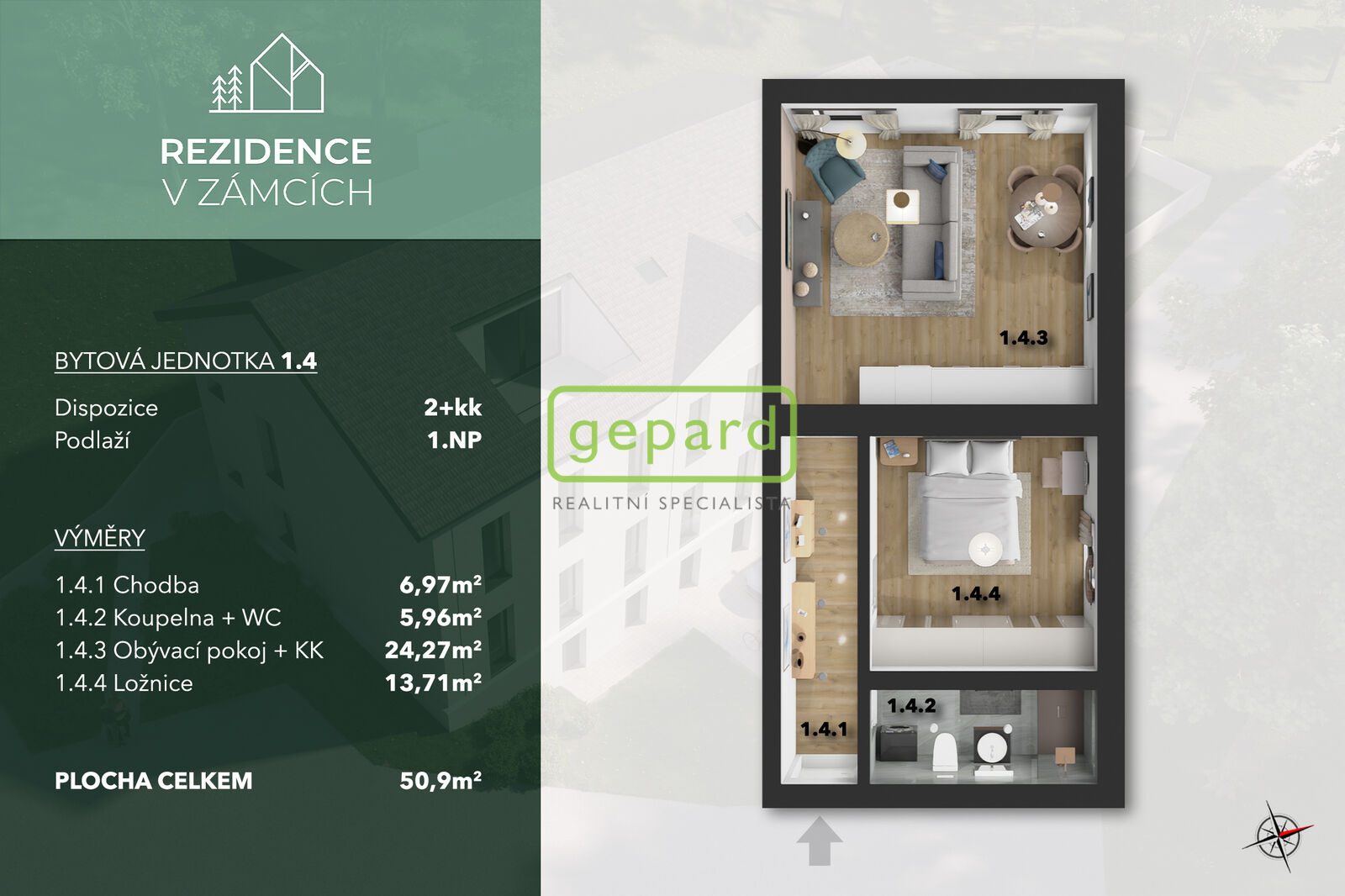 Nízkoenergetický byt (51,9 m2) o dispozici 2+kk v projektu Rezidence V Zámcích, Praha 8 je nyní k prodeji! Stavební práce budou dokončeny v 03/2026, prohlídky již teď. Byt se nachází v 1. nadzemním podlaží a disponuje vstupní halou, odkud se vchází do dalších místností: obývací pokoj, ložnice a koupelna s WC. Obývací pokoj, který je orientovaný na jihozápadní stranu a nabízí dech beroucí výhled na řeku a přírodu. Ložnice nabízí celou stěnu pro případné vložení vestavěné skříně pro maximalizaci úložného prostoru. V celém bytě najdete podlahové vytápění, což spolu s tepelným čerpadlem zaručuje nízké náklady na provoz bytu. Pro případné zvýšení komfortu je udělána příprava na klimatizaci. K bytu lze dokoupit sklep a parkovací stání. Rezidence V Zámcích je výjimečný komorní projekt o pouhých 10 bytových jednotkách, který spojuje městské bydlení v přírodě. PRVNÍ TŘI PRODANÉ BYTY MAJÍ SKLEP ZDARMA! Pro více informací či při zájmu o prohlídku mě prosím neváhejte kontaktovat.