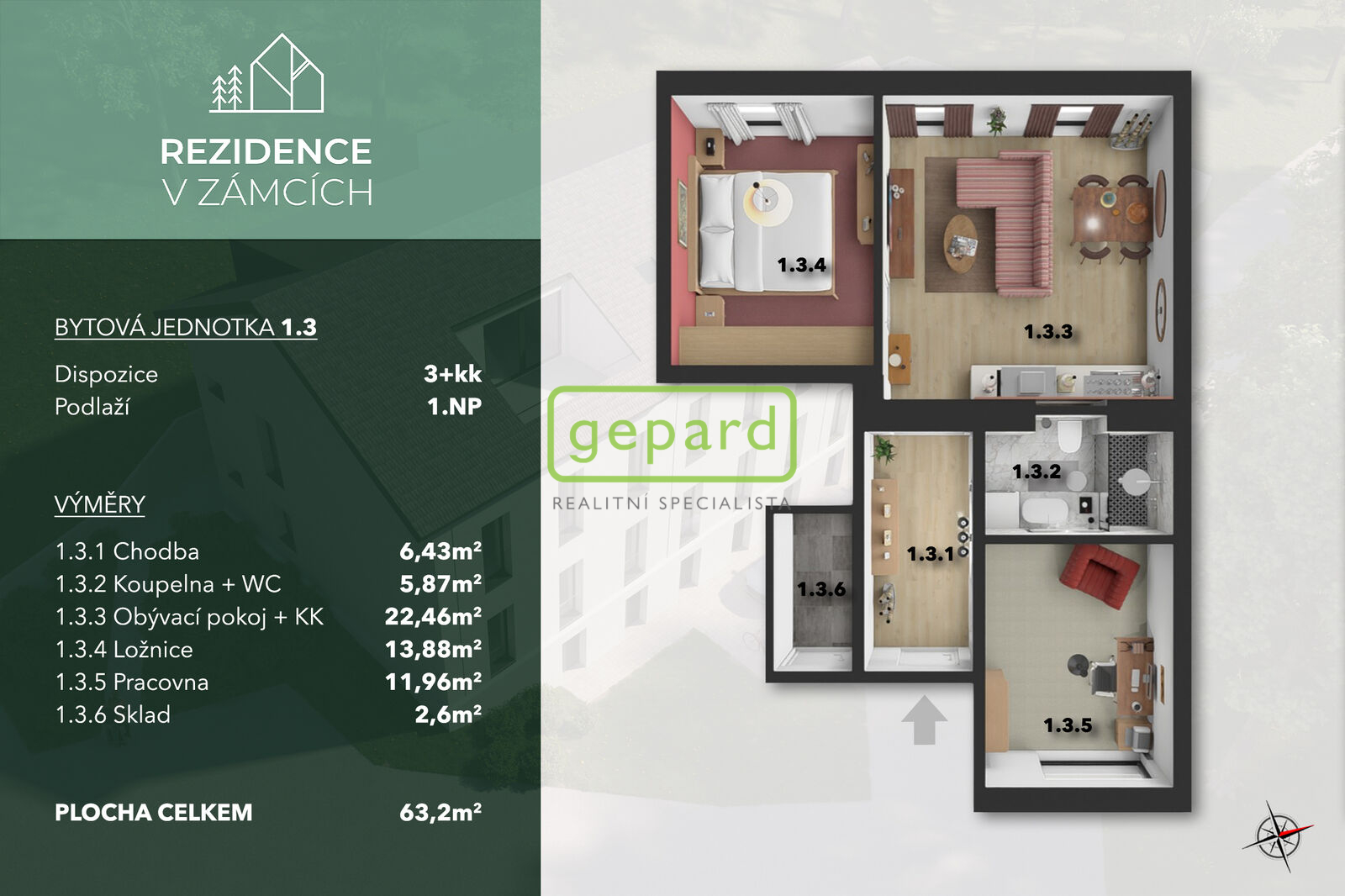 Nízkoenergetický byt (64,4 m2) o dispozici 3+kk v projektu Rezidence V Zámcích, Praha 8 je nyní k prodeji! Byt se nachází v 1. nadzemním podlaží a disponuje vstupní halou, odkud se vchází do dalších místností: obývací pokoj, ložnice a koupelna s WC. Obývací pokoj a jedna z ložnic jsou orientovány na jihozápadní stranu a nabízí dech beroucí výhled na řeku a přírodu. Druha ložnice je situována na opačné straně bytu a zajišťuje tak klid. V celém bytě najdete podlahové vytápění, což spolu s tepelným čerpadlem zaručuje nízké náklady na provoz bytu. Pro případné zvýšení komfortu je udělána příprava na klimatizaci. K bytu lze dokoupit sklep a parkovací stání. Rezidence V Zámcích je výjimečný komorní projekt o pouhých 10 bytových jednotkách, který spojuje městské bydlení v přírodě. PRVNÍ TŘI PRODANÉ BYTY MAJÍ SKLEP ZDARMA! Pro více informací či při zájmu o prohlídku mě prosím neváhejte kontaktovat.
