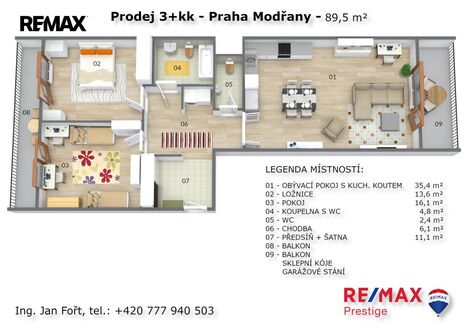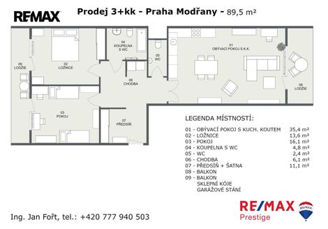 Nabízíme prodej bytu 3+kk o celkové podlahové ploše 93,8 m + dva balkóny, umístěného v posledním 5. nadzemním podlaží projektu Neo Riviera / Rezidence Modřanka. Byt se prodává pouze společně s garážovým stáním (550 000 Kč) a sklepní jednotkou (150 000 Kč). Byt se nachází ve fázi F, etapě C (objekty F10F13) v Praze 4 Modřanech. Je orientovaný na dvě světové strany a nabízí vstup na balkon z každé obytné místnosti. K dispozici jsou dva balkony o velikosti 8 m a 9 m, garážové parkovací místo a sklepní kóje o velikosti 4,3 m. Dispozice je řešena prakticky s oddělením denní a noční části. V bytě se nachází obývací pokoj s plně vybavenou kuchyňskou linkou (35,4 m), dvě ložnice orientované do klidné části areálu (16,1 m a 13,6 m), koupelna s vanou a toaletou (4,8 m), samostatná toaleta (2,4 m), předsíň s šatnou (11,1 m) a chodba s komorou (6,1 m). Součástí obytného souboru Neo Riviera / Rezidence Modřanka je upravený vnitroblok se zelení, dětským hřištěm a relaxačními zónami. Lokalita nabízí kompletní občanskou vybavenost školy, školky, obchody, restaurace i sportoviště. V pěší vzdálenosti se nachází tramvajové a autobusové zastávky, nedaleko také vlakové spojení. Okolí poskytuje přístup na cyklostezku podél Vltavy a do přírodního parku Modřanská rokle. Pro více informací a sjednání prohlídky mě neváhejte kontaktovat Prodávající si vyhrazuje právo vybrat kupujícího na základě jím zvolených kritérií. <a href="https://www.eurobydleni.cz/byty/2_1/opava/obec-opava/pronajem/"><strong>Pronájem bytu 2+1 Opava</strong></a>