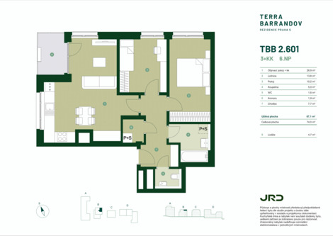 Terra Barrandov Praha 5 Barrandov, ulice Silurská 3+kk 67,1 m2 s lodžií | 6. nadzemní podlaží Orientace bytu: ZS Nabízíme moderní byt 3+kk v 6. nadzemním podlaží nového projektu Terra Barrandov. Dispozice zahrnuje obývací pokoj s kuchyňským koutem, dvě samostatné ložnice, koupelnu, samostatné WC, komoru a chodbu s dostatkem místa pro úložná řešení. Součástí bytu je lodžie o výměře 4,7 m2. K bytu náleží sklepní kóje, garážové stání je možné dokoupit. Popis a benefity projektu: Byt je součástí pasivního projektu, který klade důraz na zdravé a úsporné bydlení. Samozřejmostí je řízené větrání s rekuperací, které zajišťuje stálý přísun čerstvého vzduchu bez nutnosti větrání okny. Komfort v průběhu celého roku zvyšuje také podlahové vytápění a systém dochlazování, díky nimž je v interiéru příjemné klima v zimě i létě. Výhodou pasivního standardu jsou zároveň nižší provozní náklady. Terra Barrandov nabízí moderní bydlení propojené s přírodou i komunitním životem. Obyvatelé mohou využívat komunitní zahradu se skleníkem, klubovnu, dětské hřiště, grilovací zónu a společnou střešní terasu. Projekt je navržen tak, aby vedle soukromí v jednotlivých bytech přinášel i kvalitní společné zázemí pro každodenní život. Lokalita: Lokalita Barrandova spojuje dobrou dostupnost do centra Prahy s blízkostí přírody. V okolí najdete školy, obchody, lékárnu, kavárny, sportoviště i zastávky MHD. Pro volný čas jsou v dosahu Prokopské údolí i Chuchelský háj, které nabízejí ideální podmínky pro procházky, běh i cyklistiku. V případě zájmu nás neváhejte kontaktovat a navštivte klientské centrum developera JRD, kde si můžete prohlédnout vzorkovnu standardů i virtuální prohlídku projektu. V nabídce je celkem 225 bytů v dispozicích od 1+kk po 4+kk. <a href="https://www.eurobydleni.cz/byty/2_kk/praha-5/obec-hlubocepy/prodej/"><strong>Prodej bytu 2+kk Praha 5, Hlubočepy</strong></a>